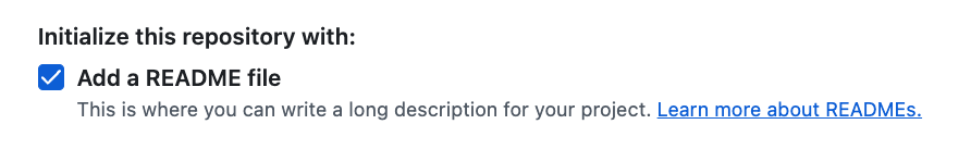 If you’re creating a repo locally first, add a README to your project’s root directory using the command, touch README.md (in the Terminal), or click New File > Text File > type README.md > OK (in RStudio’s Files pane).