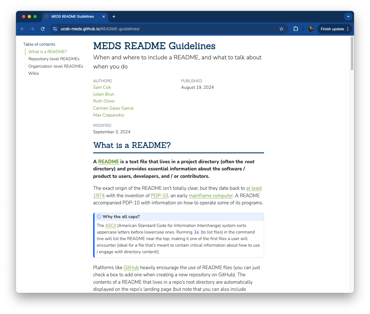These slides are adapted from the MEDS README Guidelines (mostly because it helps me stay on track while teaching ). Please be sure to reference the “official” guidelines document when you return to these in the future.