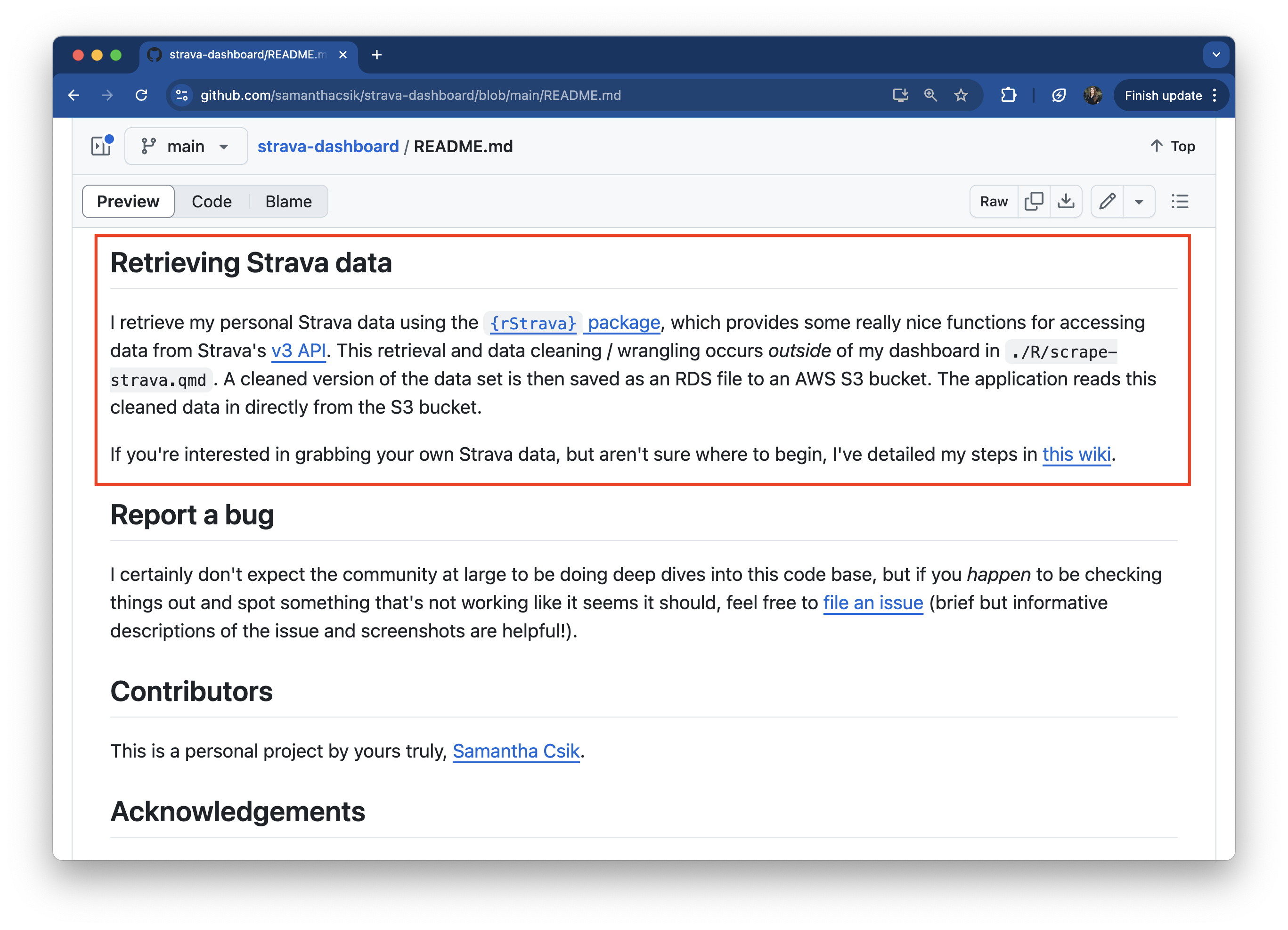 Information on what tools (i.e. {rStrava}) I used to scrape my data, where that data retrieval / wrangling occurs, and where I save my cleaned data to. Also note that I mention a wiki – more on that soon.