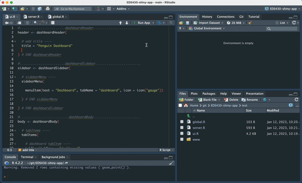 We’ll practice on our two-file-app – first, remove (or comment out) any reference to your {bslib} or {fresh} themes that we practiced applying earlier so that we’re starting off with just the default shiny styling.