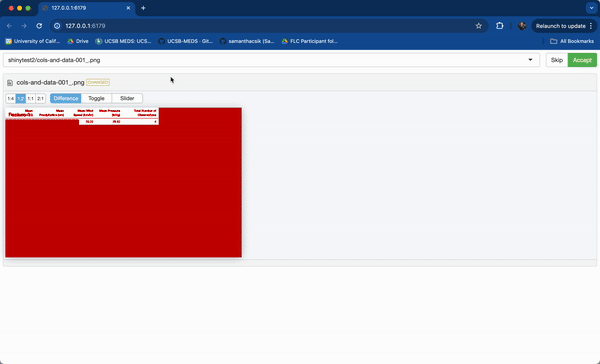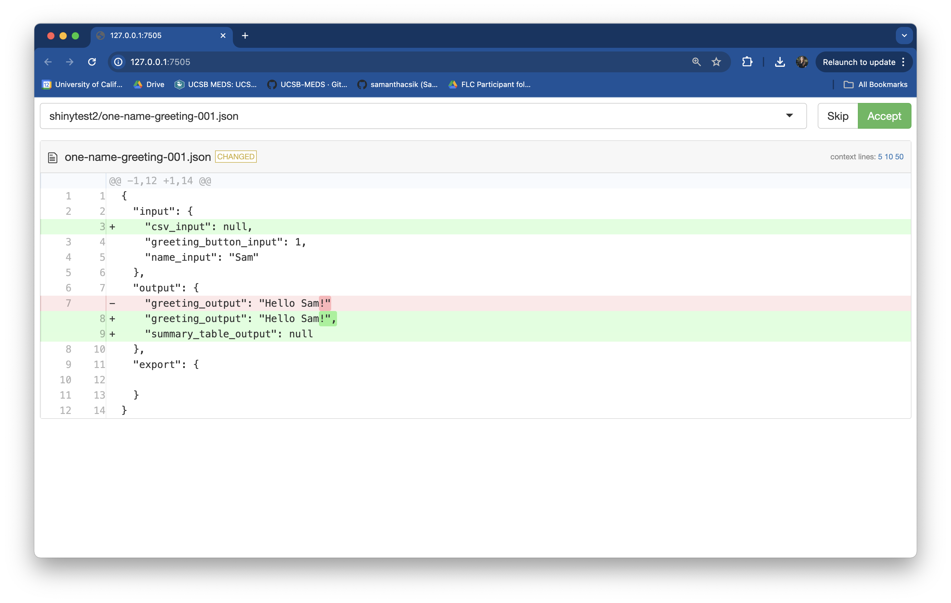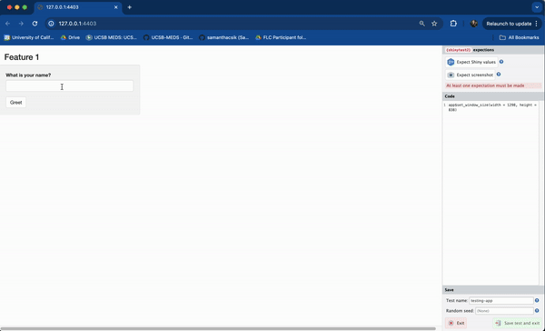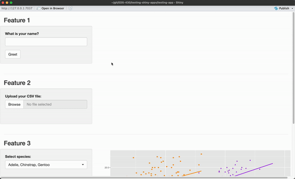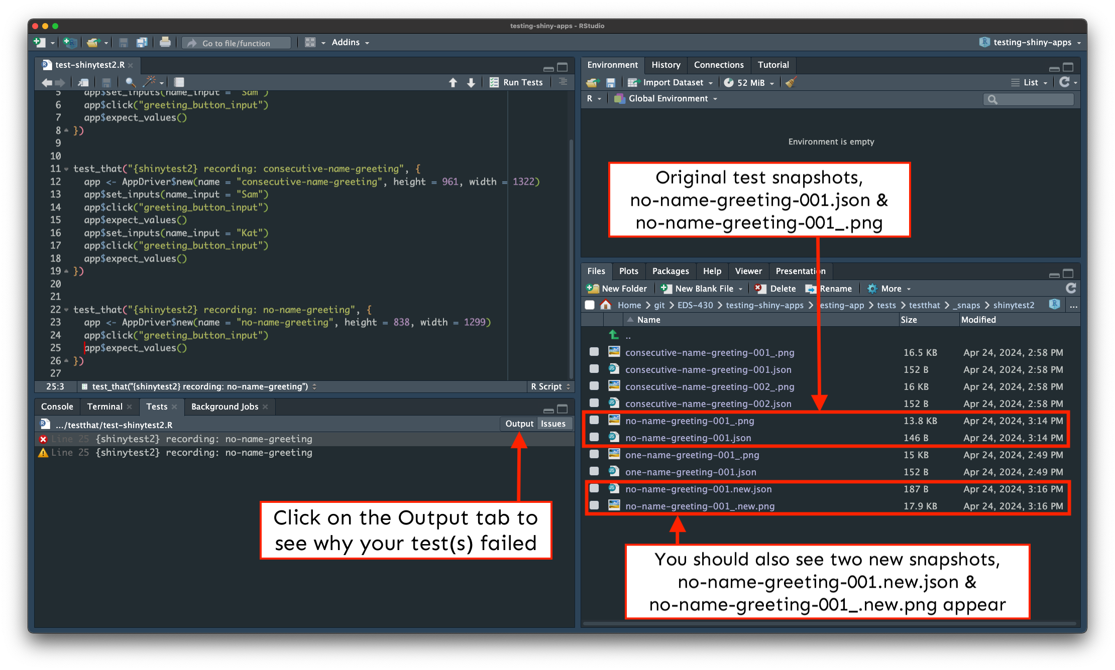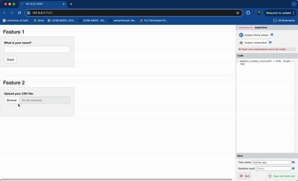 Listening on http://127.0.0.1:6179{shiny} R stderr ----------- Loading required package: shiny{shiny} R stderr ----------- Warning: package ‘shiny’ was built under R version 4.3.1{shiny} R stderr ----------- Running application in test mode.{shiny} R stderr ----------- Warning: package ‘ggplot2’ was built under R version 4.3.1{shiny} R stderr ----------- Warning: package ‘dplyr’ was built under R version 4.3.1{shiny} R stderr ----------- Warning: package ‘stringr’ was built under R version 4.3.1{shiny} R stderr -----------{shiny} R stderr ----------- Listening on http://127.0.0.1:4693{shiny} R stdout ----------- ── Attaching core tidyverse packages ──────────────────────── tidyverse 2.0.0 ──{shiny} R stdout ----------- ✔ dplyr 1.1.4 ✔ readr 2.1.4{shiny} R stdout ----------- ✔ forcats 1.0.0 ✔ stringr 1.5.1{shiny} R stdout ----------- ✔ ggplot2 3.5.0 ✔ tibble 3.2.1{shiny} R stdout ----------- ✔ lubridate 1.9.2 ✔ tidyr 1.3.0{shiny} R stdout ----------- ✔ purrr 1.0.2{shiny} R stdout ----------- ── Conflicts ────────────────────────────────────────── tidyverse_conflicts() ──{shiny} R stdout ----------- ✖ dplyr::filter() masks stats::filter(){shiny} R stdout ----------- ✖ dplyr::lag() masks stats::lag(){shiny} R stdout ----------- ℹ Use the conflicted package (<http://conflicted.r-lib.org/>) to force all conflicts to become errors{shiny} R stdout ----------- Rows:4 Columns:4{shiny} R stdout ----------- ── Column specification ────────────────────────────────────────────────────────{shiny} R stdout ----------- Delimiter:","{shiny} R stdout -----------dbl (4): temp_c, precip_cm, wind_kmhr, pressure_inhg{shiny} R stdout -----------{shiny} R stdout ----------- ℹ Use `spec()` to retrieve the full column specification for this data.{shiny} R stdout ----------- ℹ Specify the column types or set `show_col_types = FALSE` to quiet this message.• Saving test file: tests/testthat/test-shinytest2.R• Modify '/Users/samanthacsik/git/EDS-430/testing-shiny-apps/testing-app/tests/testthat/test-shinytest2.R'• Running recorded test: tests/testthat/test-shinytest2.RLoading required package: testthat── Attaching core tidyverse packages ─────────────────────────────────────────────────────────────────────── tidyverse 2.0.0 ──✔ dplyr 1.1.4 ✔ readr 2.1.4✔ forcats 1.0.0 ✔ stringr 1.5.1✔ ggplot2 3.5.0 ✔ tibble 3.2.1✔ lubridate 1.9.2 ✔ tidyr 1.3.0✔ purrr 1.0.2── Conflicts ───────────────────────────────────────────────────────────────────────────────────────── tidyverse_conflicts() ──✖ readr::edition_get() masks testthat::edition_get()✖ dplyr::filter() masks stats::filter()✖ purrr::is_null() masks testthat::is_null()✖ dplyr::lag() masks stats::lag()✖ readr::local_edition() masks testthat::local_edition()✖ dplyr::matches() masks tidyr::matches(), testthat::matches()ℹ Use the conflicted package to force all conflicts to become errors✔ | F W S OK | Context✖ |461| shinytest2 [7.4s] ───────────────────────────────────────────────────────────────────────────────────────────────────────────────────────────────Failure (test-shinytest2.R:7:3): {shinytest2} recording: one-name-greetingSnapshot of `file` to 'shinytest2/one-name-greeting-001.json' has changedRun testthat::snapshot_review('shinytest2/') to review changesBacktrace: ▆1. └─app$expect_values() at test-shinytest2.R:7:32. └─shinytest2:::app_expect_values(...)3. └─shinytest2:::app__expect_snapshot_file(...)4. ├─base::withCallingHandlers(...)5. └─testthat::expect_snapshot_file(...)Warning (test-shinytest2.R:7:3): {shinytest2} recording: one-name-greetingDiff in snapshot file `shinytest2one-name-greeting-001.json`< before > after @@1,9@@@@1,11@@ { { "input": { "input": { ~>"csv_input": null, "greeting_button_input":1, "greeting_button_input":1, "name_input":"Sam""name_input":"Sam" }, }, "output": { "output": { <"greeting_output":"Hello Sam!">"greeting_output":"Hello Sam!",~>"summary_table_output": null }, }, "export": { "export": { Failure (test-shinytest2.R:15:3): {shinytest2} recording: consecutive-name-greetingSnapshot of `file` to 'shinytest2/consecutive-name-greeting-001.json' has changedRun testthat::snapshot_review('shinytest2/') to review changesBacktrace: ▆1. └─app$expect_values() at test-shinytest2.R:15:32. └─shinytest2:::app_expect_values(...)3. └─shinytest2:::app__expect_snapshot_file(...)4. ├─base::withCallingHandlers(...)5. └─testthat::expect_snapshot_file(...)Warning (test-shinytest2.R:15:3): {shinytest2} recording: consecutive-name-greetingDiff in snapshot file `shinytest2consecutive-name-greeting-001.json`< before > after @@1,9@@@@1,11@@ { { "input": { "input": { ~>"csv_input": null, "greeting_button_input":1, "greeting_button_input":1, "name_input":"Sam""name_input":"Sam" }, }, "output": { "output": { <"greeting_output":"Hello Sam!">"greeting_output":"Hello Sam!",~>"summary_table_output": null }, }, "export": { "export": { Failure (test-shinytest2.R:18:3): {shinytest2} recording: consecutive-name-greetingSnapshot of `file` to 'shinytest2/consecutive-name-greeting-002.json' has changedRun testt