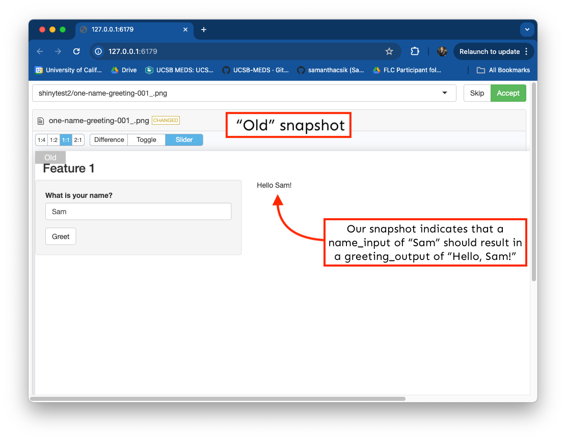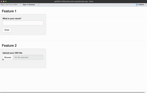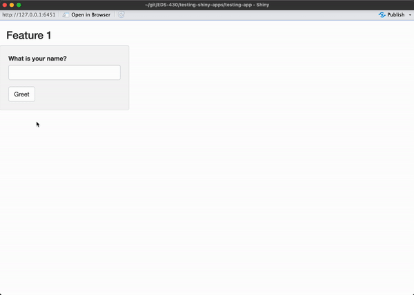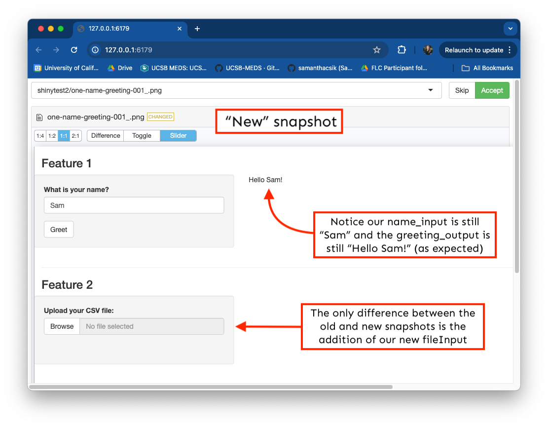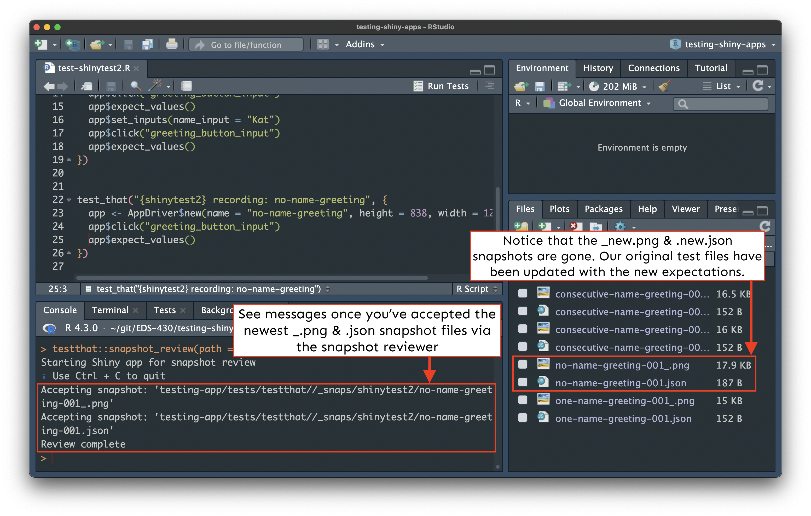 Listening on http://127.0.0.1:6179{shiny} R stderr ----------- Loading required package: shiny{shiny} R stderr ----------- Warning: package ‘shiny’ was built under R version 4.3.1{shiny} R stderr ----------- Running application in test mode.{shiny} R stderr ----------- Warning: package ‘ggplot2’ was built under R version 4.3.1{shiny} R stderr ----------- Warning: package ‘dplyr’ was built under R version 4.3.1{shiny} R stderr ----------- Warning: package ‘stringr’ was built under R version 4.3.1{shiny} R stderr -----------{shiny} R stderr ----------- Listening on http://127.0.0.1:4693{shiny} R stdout ----------- ── Attaching core tidyverse packages ──────────────────────── tidyverse 2.0.0 ──{shiny} R stdout ----------- ✔ dplyr 1.1.4 ✔ readr 2.1.4{shiny} R stdout ----------- ✔ forcats 1.0.0 ✔ stringr 1.5.1{shiny} R stdout ----------- ✔ ggplot2 3.5.0 ✔ tibble 3.2.1{shiny} R stdout ----------- ✔ lubridate 1.9.2 ✔ tidyr 1.3.0{shiny} R stdout ----------- ✔ purrr 1.0.2{shiny} R stdout ----------- ── Conflicts ────────────────────────────────────────── tidyverse_conflicts() ──{shiny} R stdout ----------- ✖ dplyr::filter() masks stats::filter(){shiny} R stdout ----------- ✖ dplyr::lag() masks stats::lag(){shiny} R stdout ----------- ℹ Use the conflicted package (<http://conflicted.r-lib.org/>) to force all conflicts to become errors{shiny} R stdout ----------- Rows:4 Columns:4{shiny} R stdout ----------- ── Column specification ────────────────────────────────────────────────────────{shiny} R stdout ----------- Delimiter:","{shiny} R stdout -----------dbl (4): temp_c, precip_cm, wind_kmhr, pressure_inhg{shiny} R stdout -----------{shiny} R stdout ----------- ℹ Use `spec()` to retrieve the full column specification for this data.{shiny} R stdout ----------- ℹ Specify the column types or set `show_col_types = FALSE` to quiet this message.• Saving test file: tests/testthat/test-shinytest2.R• Modify '/Users/samanthacsik/git/EDS-430/testing-shiny-apps/testing-app/tests/testthat/test-shinytest2.R'• Running recorded test: tests/testthat/test-shinytest2.RLoading required package: testthat── Attaching core tidyverse packages ─────────────────────────────────────────────────────────────────────── tidyverse 2.0.0 ──✔ dplyr 1.1.4 ✔ readr 2.1.4✔ forcats 1.0.0 ✔ stringr 1.5.1✔ ggplot2 3.5.0 ✔ tibble 3.2.1✔ lubridate 1.9.2 ✔ tidyr 1.3.0✔ purrr 1.0.2── Conflicts ───────────────────────────────────────────────────────────────────────────────────────── tidyverse_conflicts() ──✖ readr::edition_get() masks testthat::edition_get()✖ dplyr::filter() masks stats::filter()✖ purrr::is_null() masks testthat::is_null()✖ dplyr::lag() masks stats::lag()✖ readr::local_edition() masks testthat::local_edition()✖ dplyr::matches() masks tidyr::matches(), testthat::matches()ℹ Use the conflicted package to force all conflicts to become errors✔ | F W S OK | Context✖ |461| shinytest2 [7.4s] ───────────────────────────────────────────────────────────────────────────────────────────────────────────────────────────────Failure (test-shinytest2.R:7:3): {shinytest2} recording: one-name-greetingSnapshot of `file` to 'shinytest2/one-name-greeting-001.json' has changedRun testthat::snapshot_review('shinytest2/') to review changesBacktrace: ▆1. └─app$expect_values() at test-shinytest2.R:7:32. └─shinytest2:::app_expect_values(...)3. └─shinytest2:::app__expect_snapshot_file(...)4. ├─base::withCallingHandlers(...)5. └─testthat::expect_snapshot_file(...)Warning (test-shinytest2.R:7:3): {shinytest2} recording: one-name-greetingDiff in snapshot file `shinytest2one-name-greeting-001.json`< before > after @@1,9@@@@1,11@@ { { "input": { "input": { ~>"csv_input": null, "greeting_button_input":1, "greeting_button_input":1, "name_input":"Sam""name_input":"Sam" }, }, "output": { "output": { <"greeting_output":"Hello Sam!">"greeting_output":"Hello Sam!",~>"summary_table_output": null }, }, "export": { "export": { Failure (test-shinytest2.R:15:3): {shinytest2} recording: consecutive-name-greetingSnapshot of `file` to 'shinytest2/consecutive-name-greeting-001.json' has changedRun testthat::snapshot_review('shinytest2/') to review changesBacktrace: ▆1. └─app$expect_values() at test-shinytest2.R:15:32. └─shinytest2:::app_expect_values(...)3. └─shinytest2:::app__expect_snapshot_file(...)4. ├─base::withCallingHandlers(...)5. └─testthat::expect_snapshot_file(...)Warning (test-shinytest2.R:15:3): {shinytest2} recording: consecutive-name-greetingDiff in snapshot file `shinytest2consecutive-name-greeting-001.json`< before > after @@1,9@@@@1,11@@ { { "input": { "input": { ~>"csv_input": null, "greeting_button_input":1, "greeting_button_input":1, "name_input":"Sam""name_input":"Sam" }, }, "output": { "output": { <"greeting_output":"Hello Sam!">"greeting_output":"Hello Sam!",~>"summary_table_output": null }, }, "export": { "export": { Failure (test-shinytest2.R:18:3): {shinytest2} recording: consecutive-name-greetingSnapshot of `file` to 'shinytest2/consecutive-name-greeting-002.json' has changedRun testt