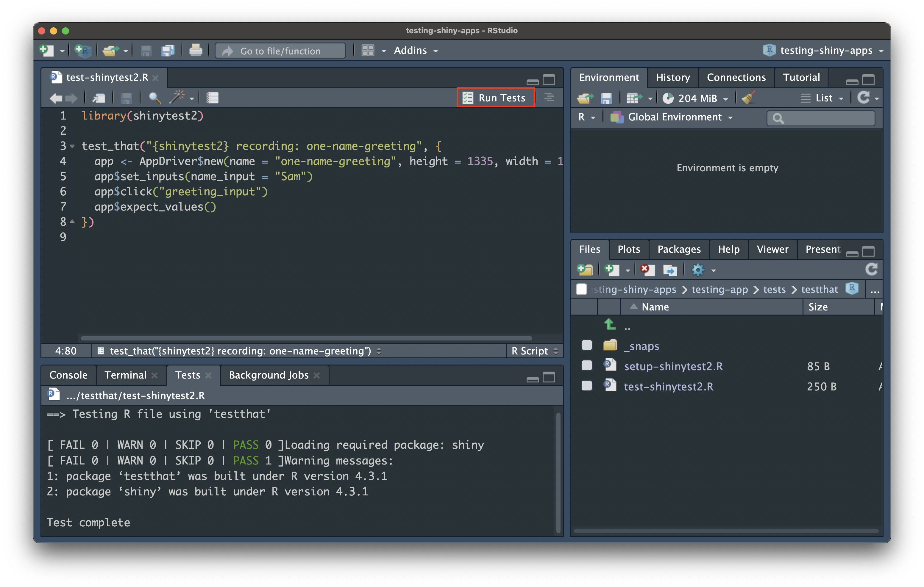 Open test-shinytest2.R, click Run Tests, and watch all of your tests pass (or at least, they should!):