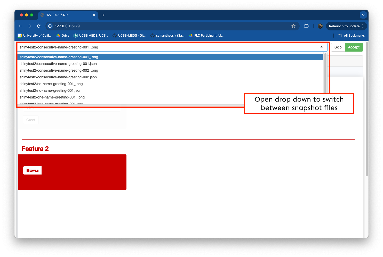 We can use use testthat::snapshot_review(), which opens a Shiny app for visually comparing differences (aka diffs) between snapshots and accepting (or rejecting) updates.