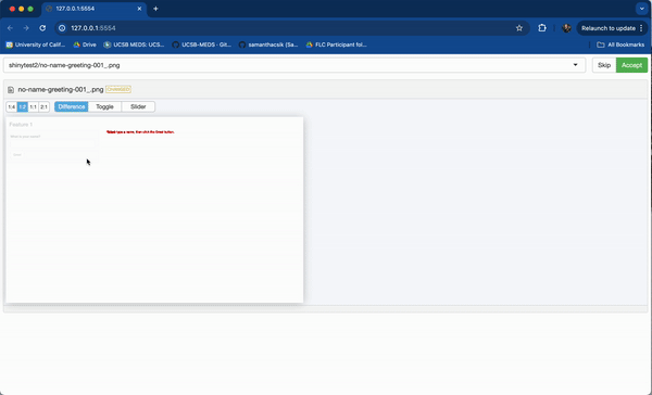 ==> Testing R file using 'testthat'Loading required package: shiny[ FAIL 1| WARN 1| SKIP 0| PASS 3 ]── Failure (test-shinytest2.R:25:3): {shinytest2} recording: no-name-greeting ──Snapshot of `file` to 'shinytest2/no-name-greeting-001.json' has changedRun testthat::snapshot_review('shinytest2/') to review changesBacktrace: ▆1. └─app$expect_values() at test-shinytest2.R:25:32. └─shinytest2:::app_expect_values(...)3. └─shinytest2:::app__expect_snapshot_file(...)4. ├─base::withCallingHandlers(...)5. └─testthat::expect_snapshot_file(...)── Warning (test-shinytest2.R:25:3): {shinytest2} recording: no-name-greeting ──Diff in snapshot file `shinytest2no-name-greeting-001.json`< before > after @@5,5/5,5@@}, "output": { <"greeting_output":"Hello !">"greeting_output":"Please type a name, then click the Greet button." }, "export": { [ FAIL 1| WARN 1| SKIP 0| PASS 3 ]Warning messages:1: package ‘testthat’ was built under R version 4.3.12: package ‘shiny’ was built under R version 4.3.1Test complete