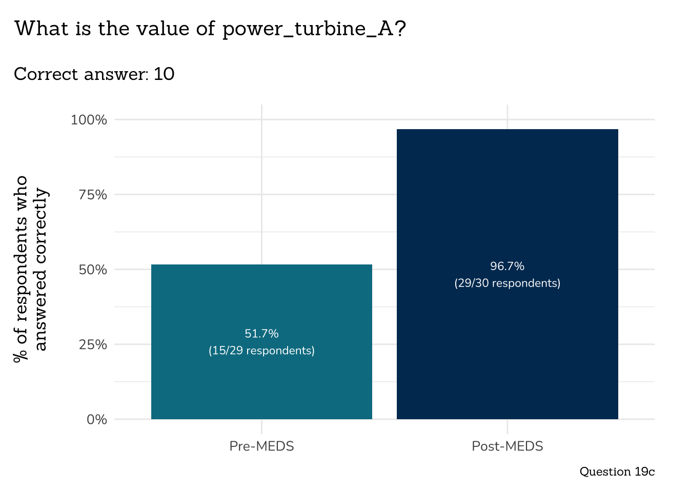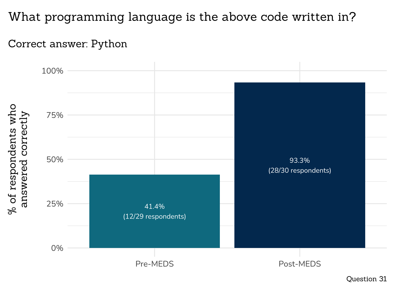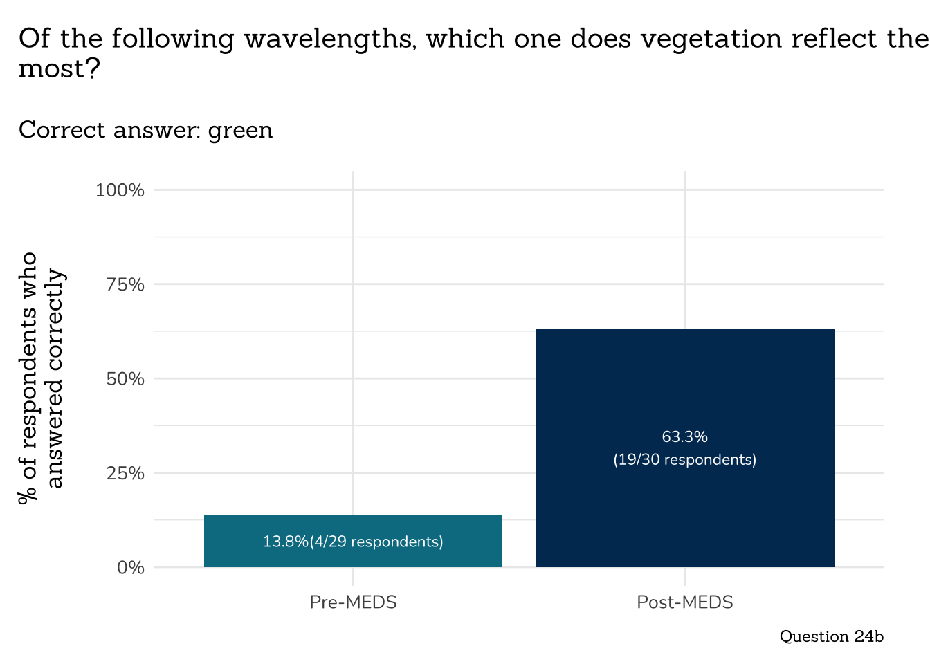 There are 14 questions which have a correct answer. These questions always follow at least one “gate” question. The results of these questions are presented as a comparison between the percentage of Pre- and Post-MEDS respondents who answered it correctly. It’s important to note that these percentages are calculated based on the total number of students who participated in the assessment (that is 29 for the Pre-MEDS assessment and 30 for the Post-MEDS assessment), and not the number of students who proceeded past the “gate” question(s).