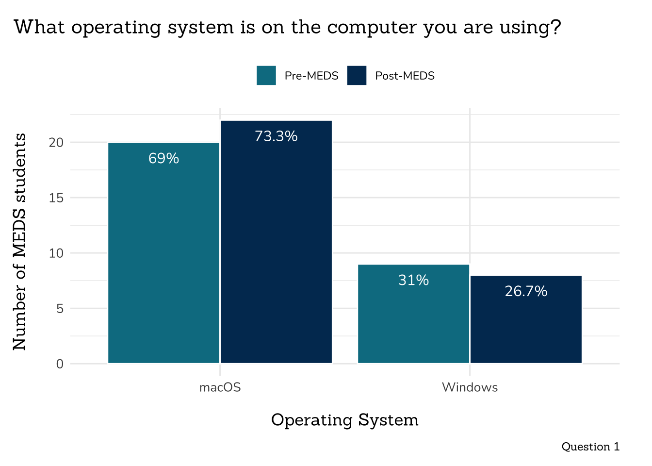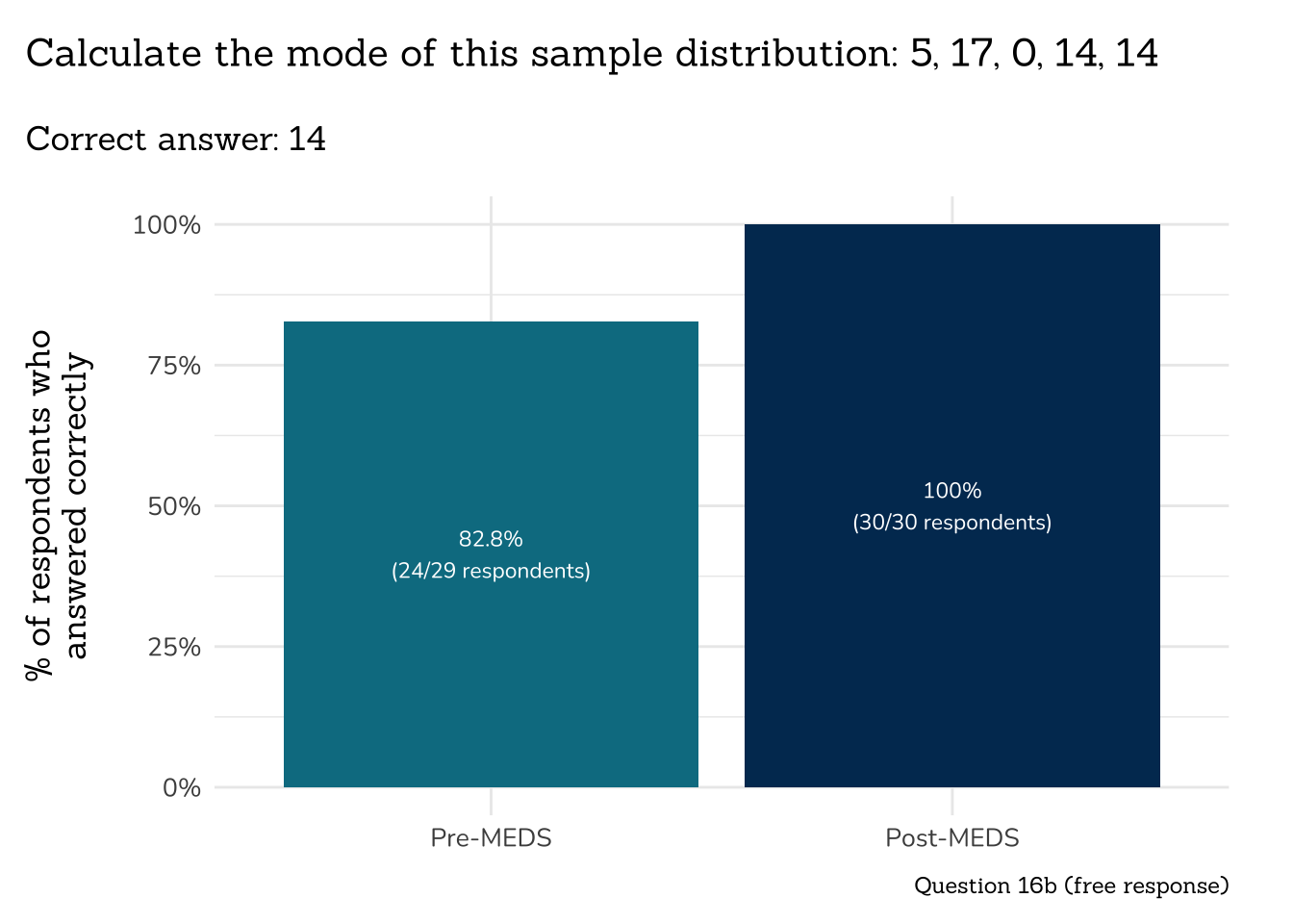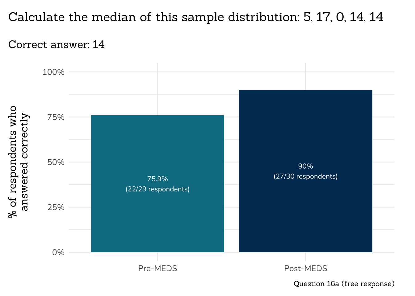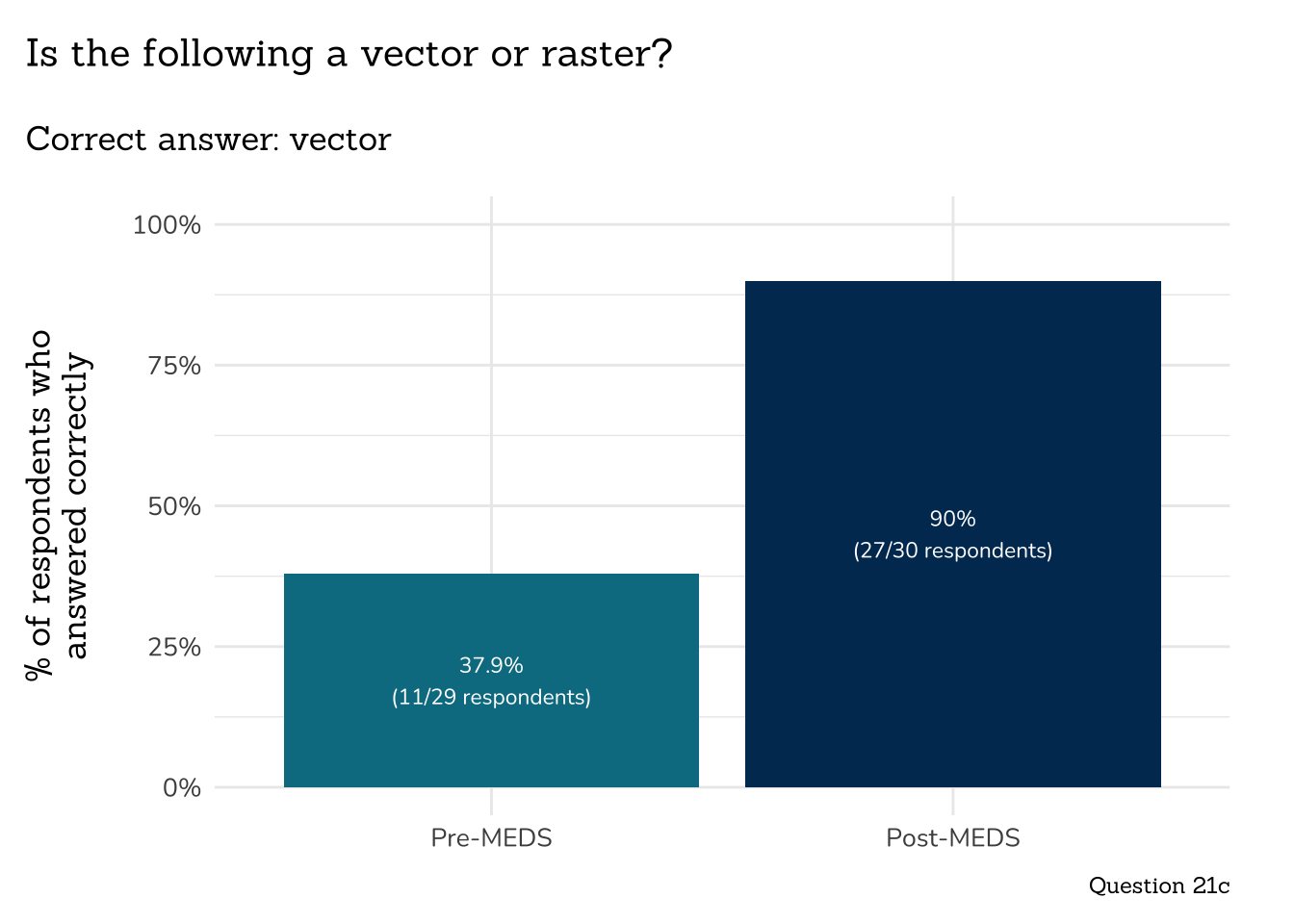 There are 14 questions which have a correct answer. These questions always follow at least one “gate” question. The results of these questions are presented as a comparison between the percentage of Pre- and Post-MEDS respondents who answered it correctly. It’s important to note that these percentages are calculated based on the total number of students who participated in the assessment (that is 29 for the Pre-MEDS assessment and 30 for the Post-MEDS assessment), and not the number of students who proceeded past the “gate” question(s).