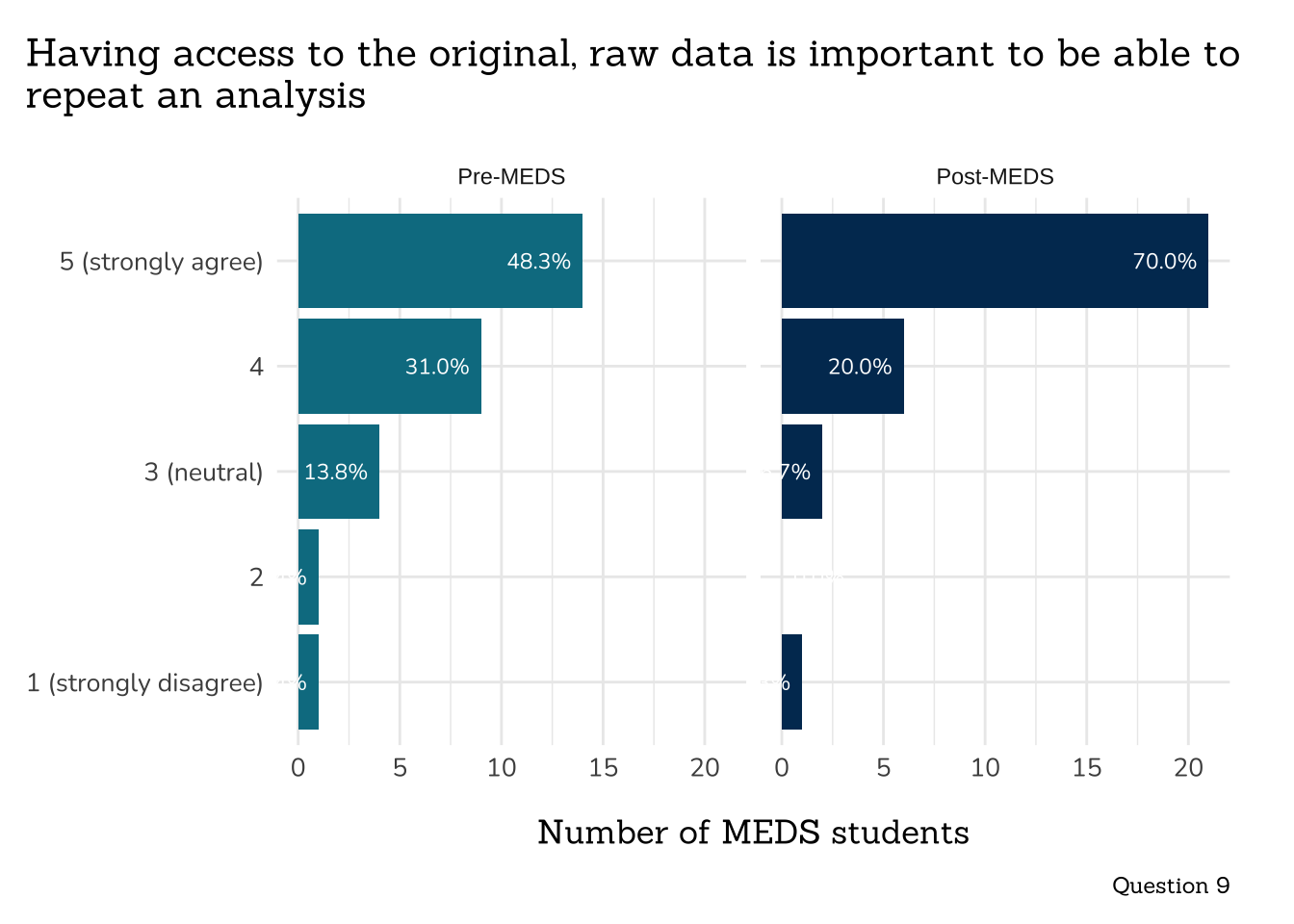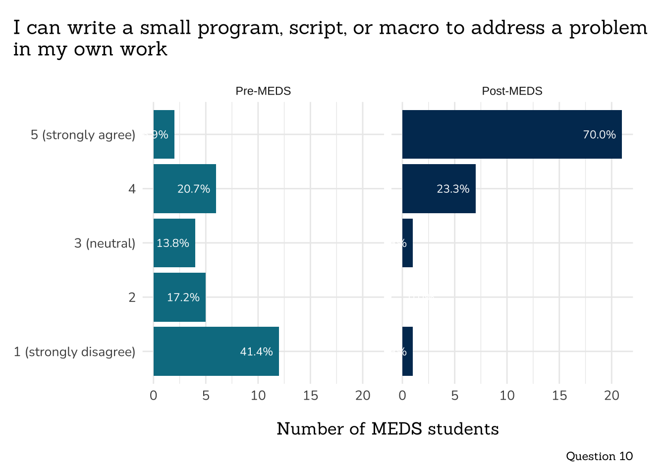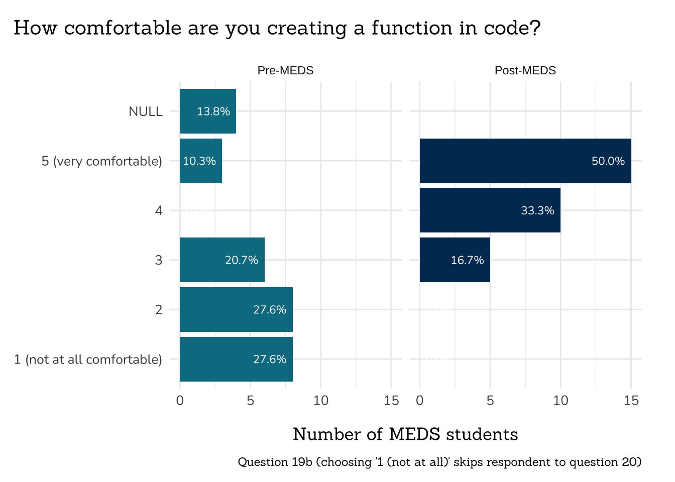 Post-MEDS: 29/30 student respondents (96.7%) answered “Yes” to Question 21a, and therefore were directed to answer Questions 21b & 21c. Those who answered “1” (1 students) were jumped directly to Question 22.