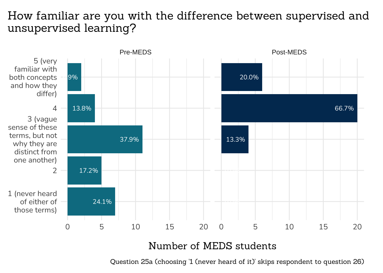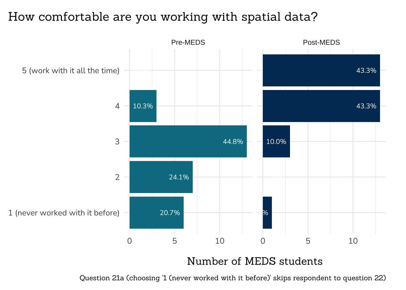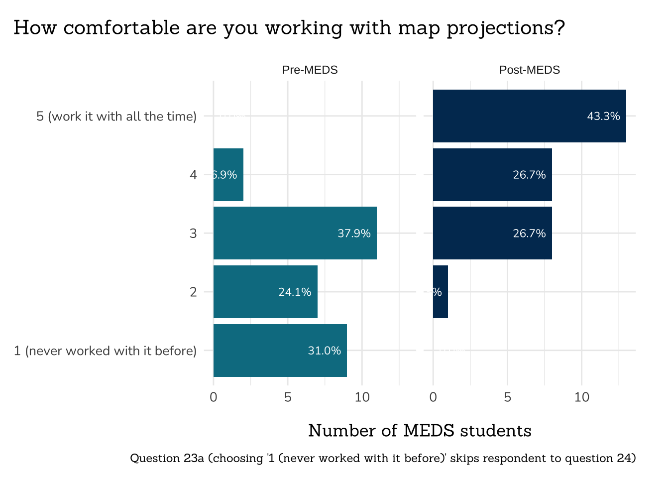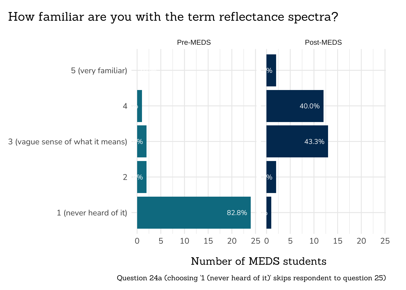 Pre-MEDS: 22/29 student respondents (75.9%) chose a familiarity level of 2 or greater, and therefore were directed to answer Question 25b. Those who answered “1” (7 students) were jumped directly to Question 26 – these non-responses are missing from the Question 25b plot, below, which is why percentages for the Pre-MEDS assessment do not add up to 100%.