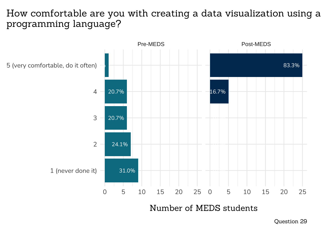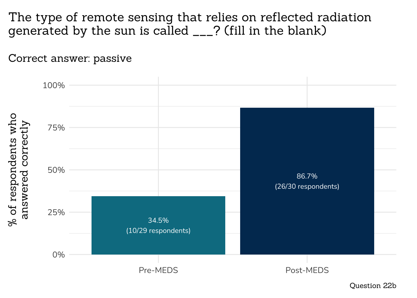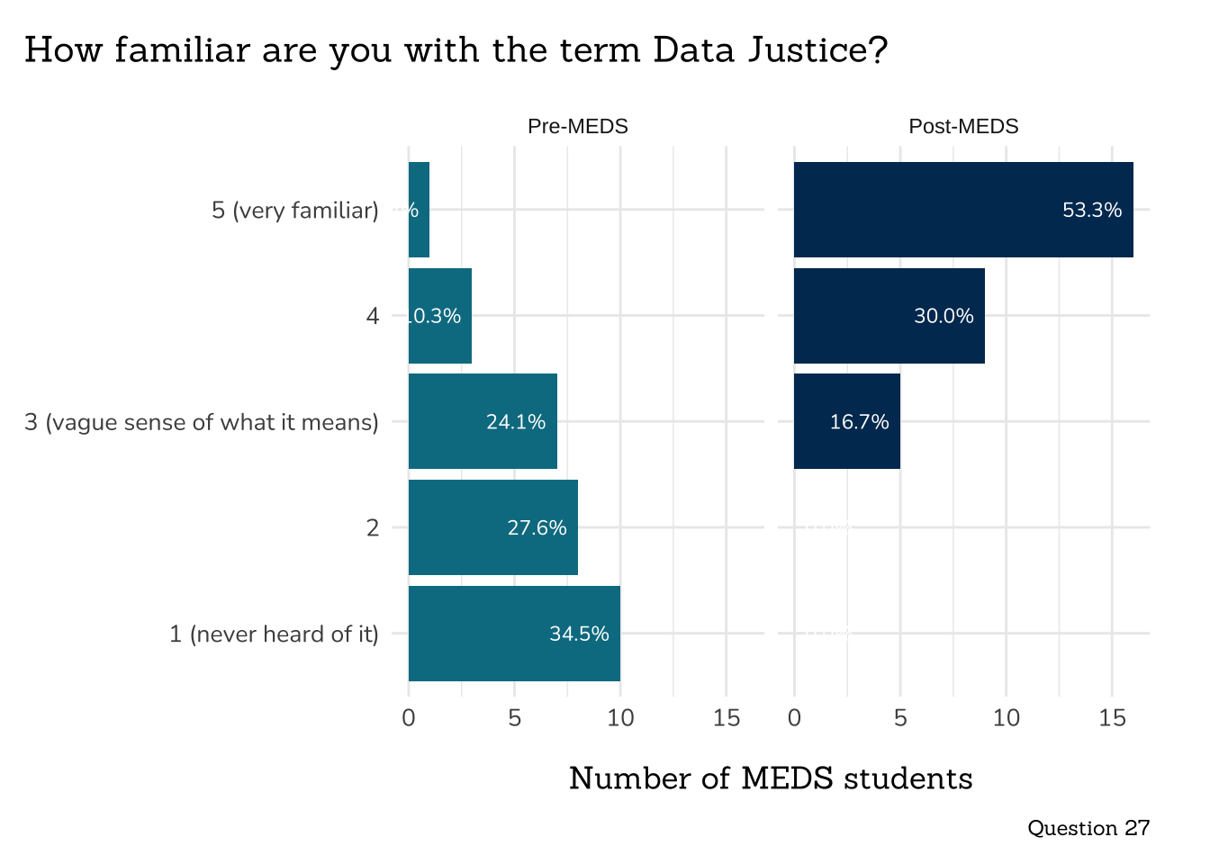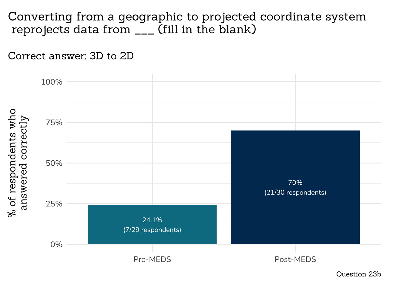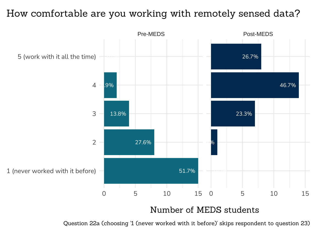 Pre-MEDS: 22/29 student respondents (75.9%) chose a familiarity level of 2 or greater, and therefore were directed to answer Question 25b. Those who answered “1” (7 students) were jumped directly to Question 26 – these non-responses are missing from the Question 25b plot, below, which is why percentages for the Pre-MEDS assessment do not add up to 100%.