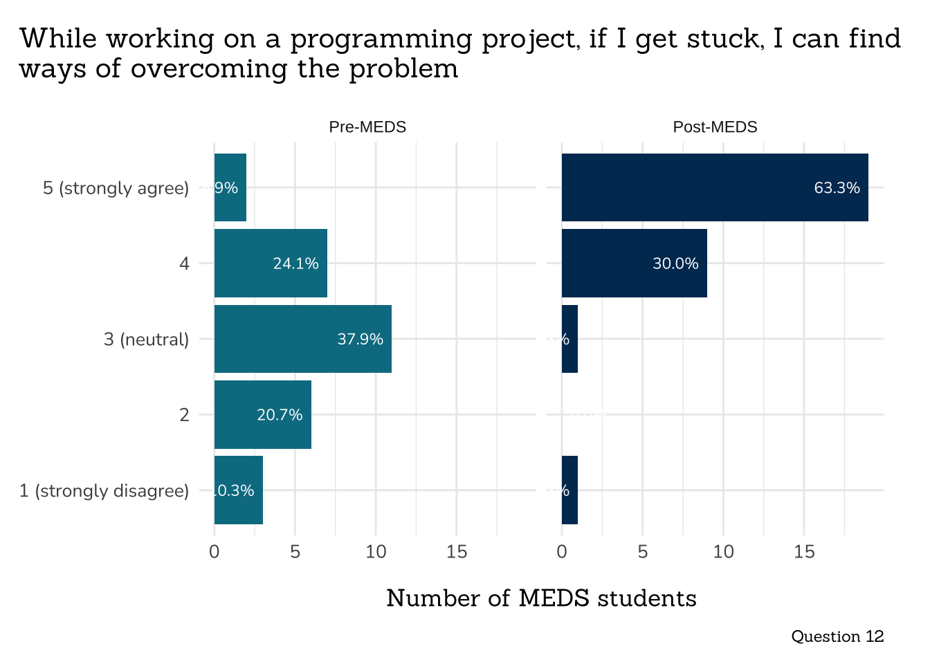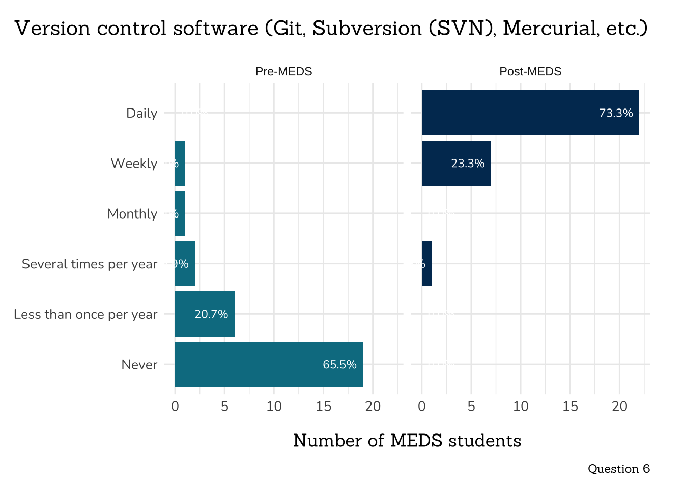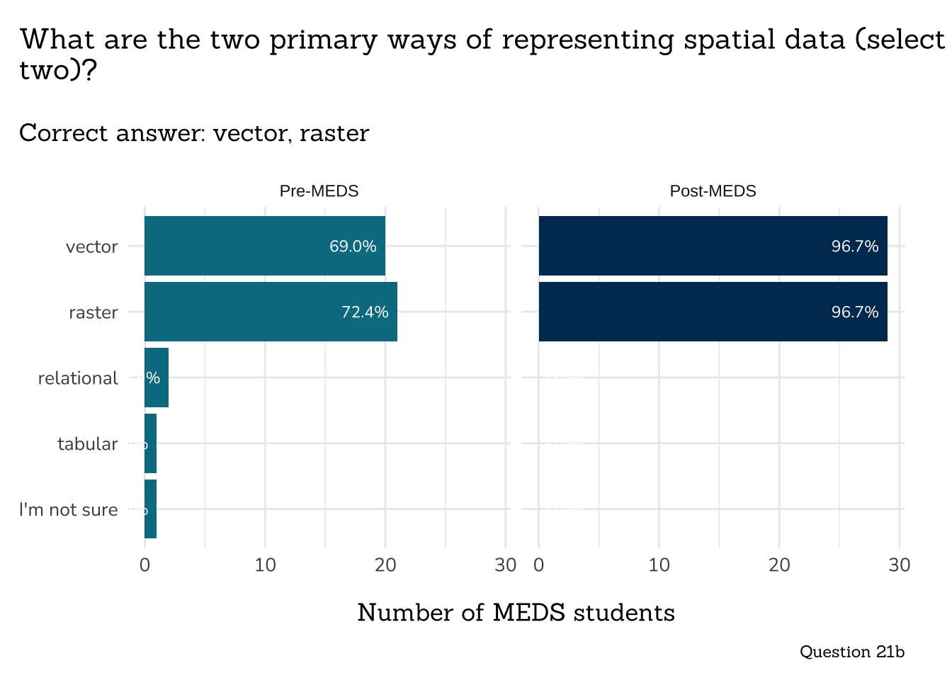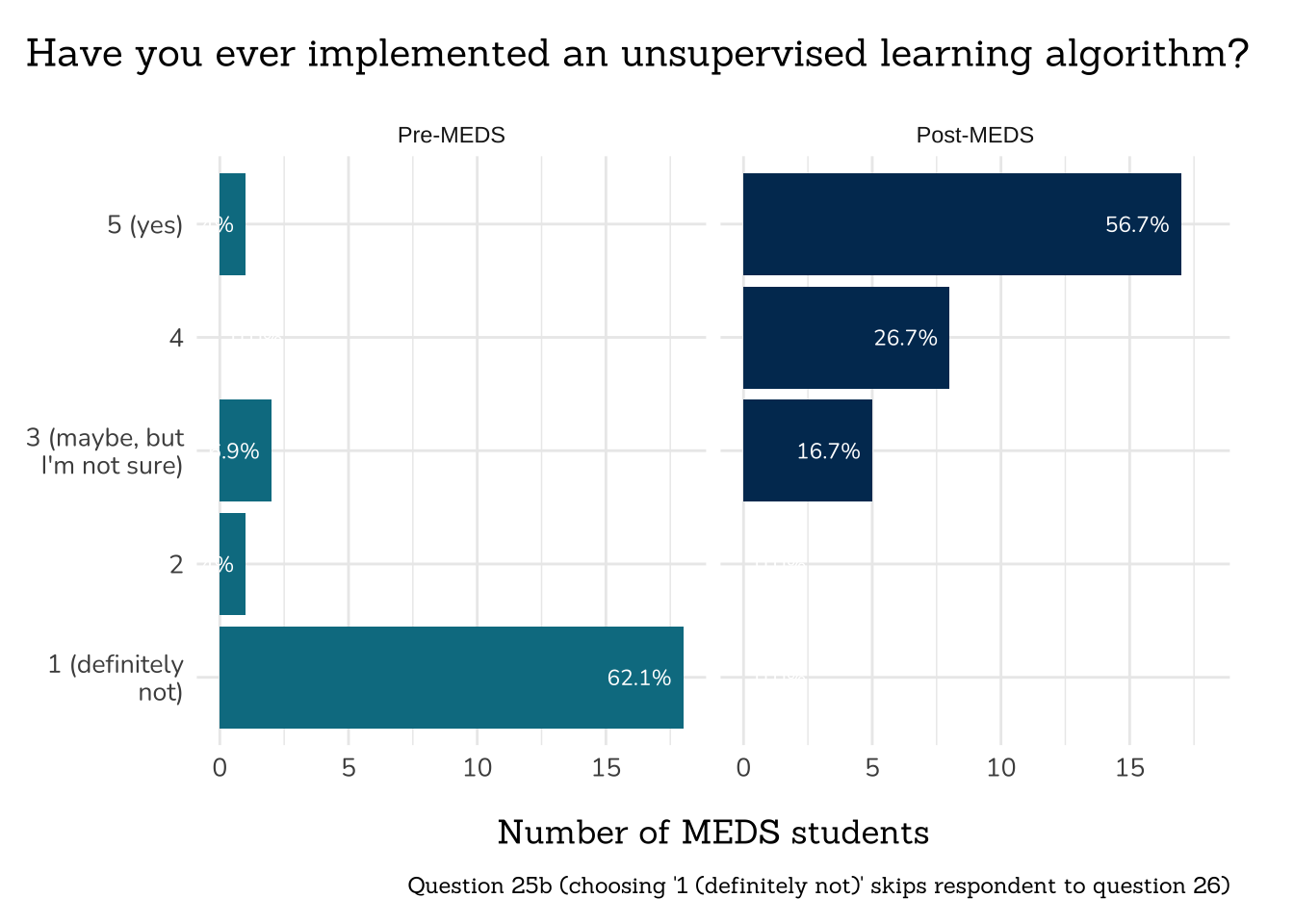 Pre-MEDS: 22/29 student respondents (75.9%) chose a familiarity level of 2 or greater, and therefore were directed to answer Question 25b. Those who answered “1” (7 students) were jumped directly to Question 26 – these non-responses are missing from the Question 25b plot, below, which is why percentages for the Pre-MEDS assessment do not add up to 100%.