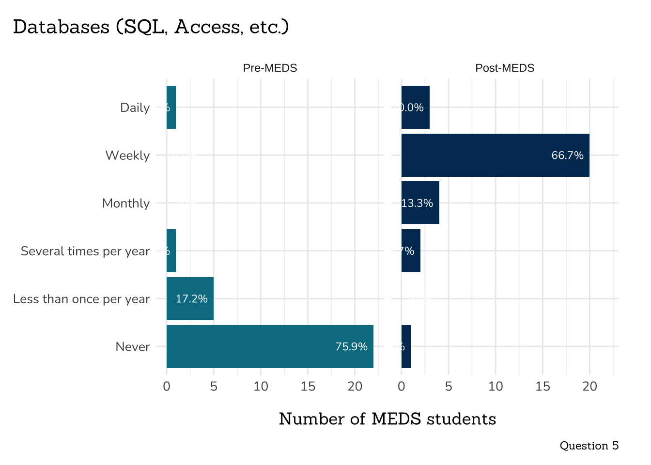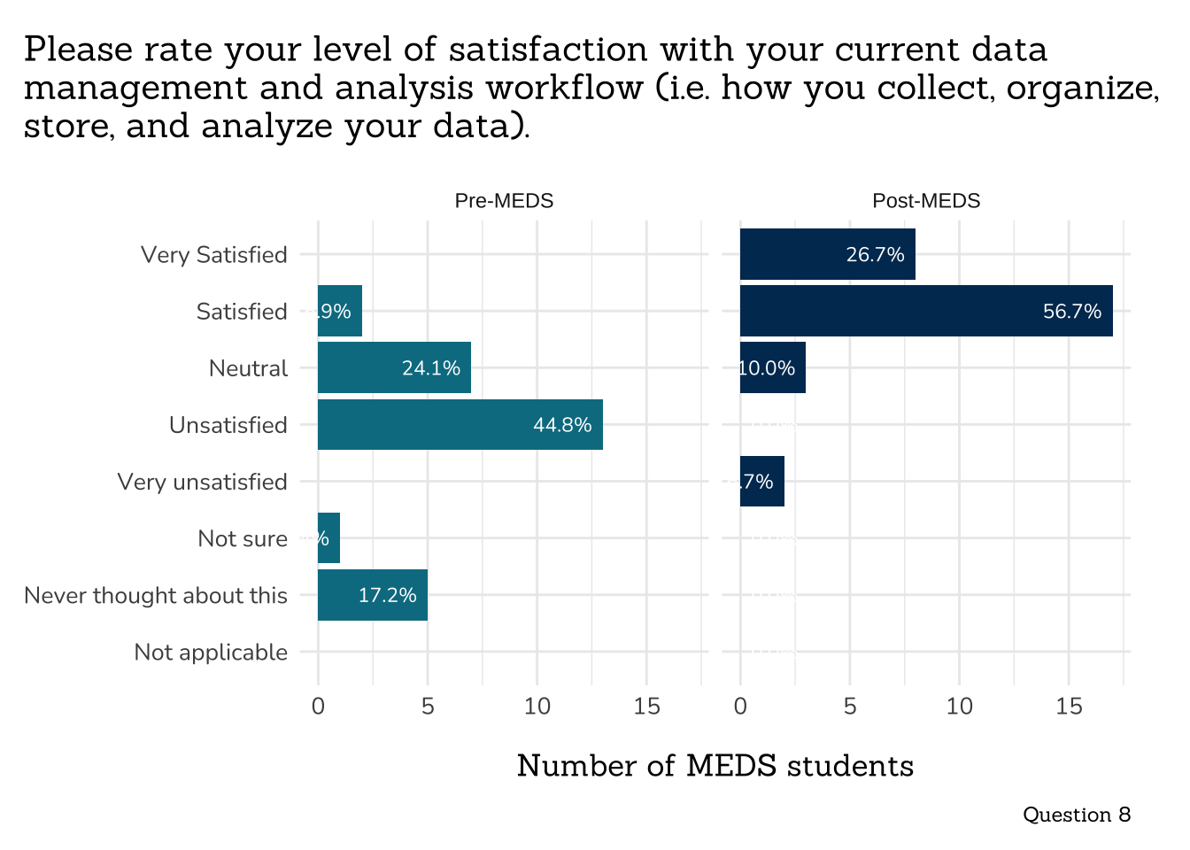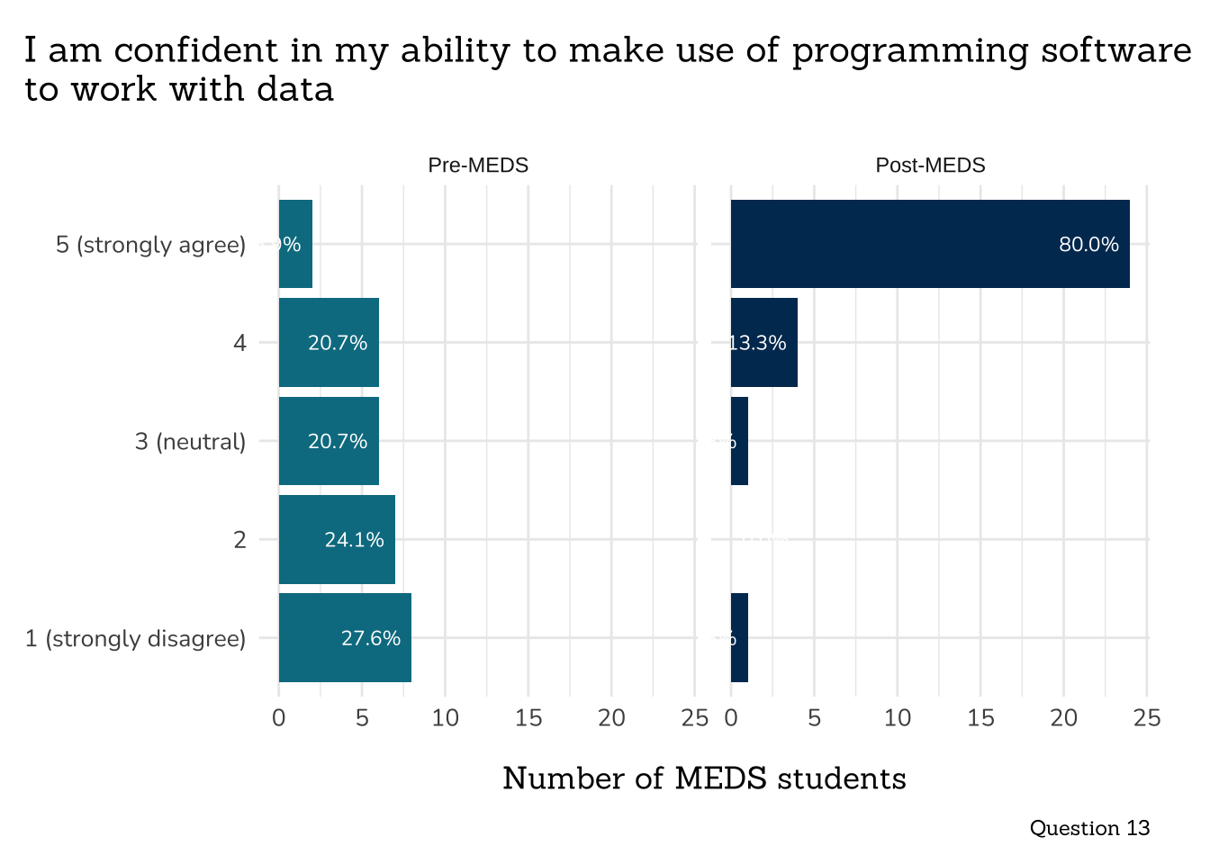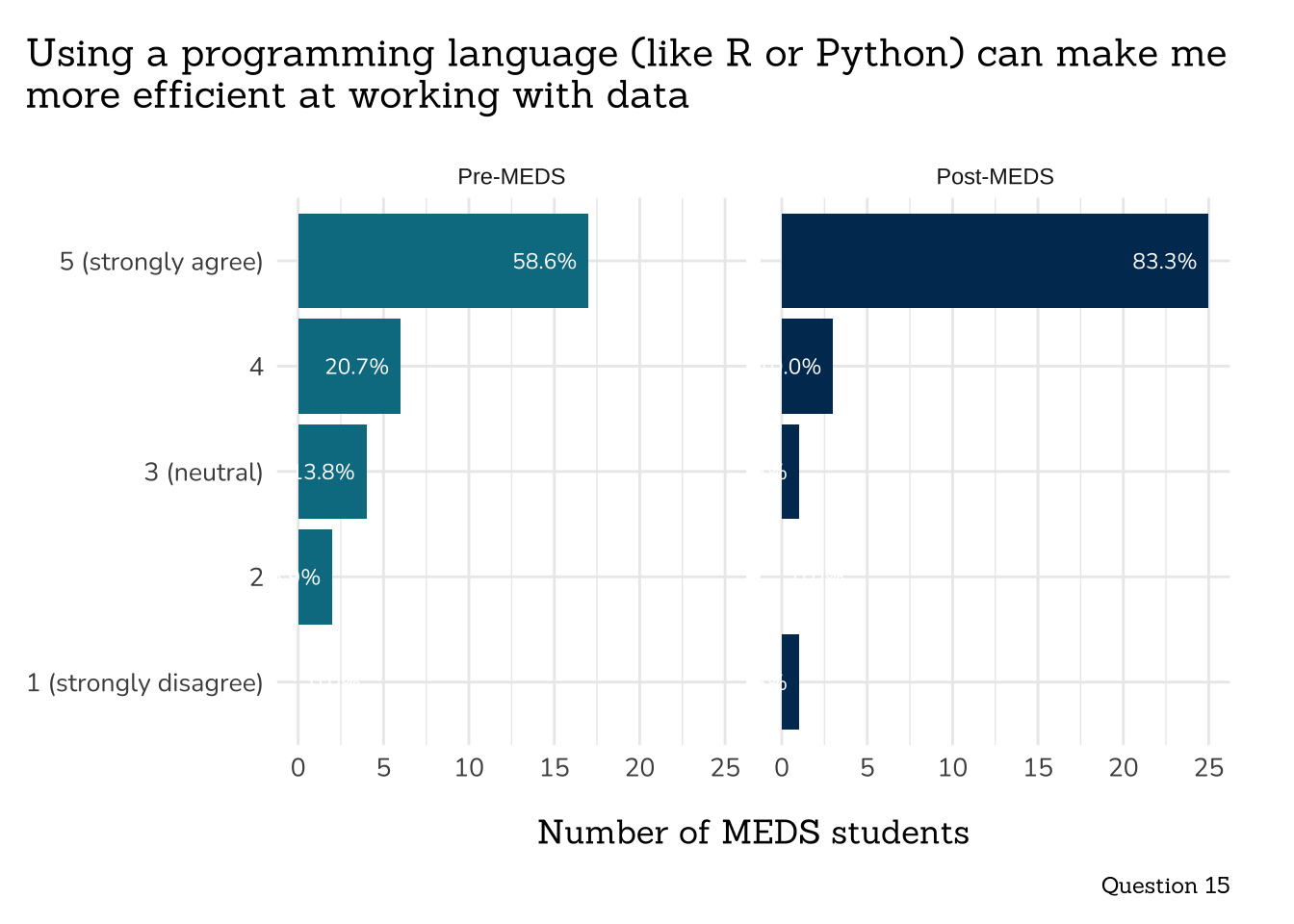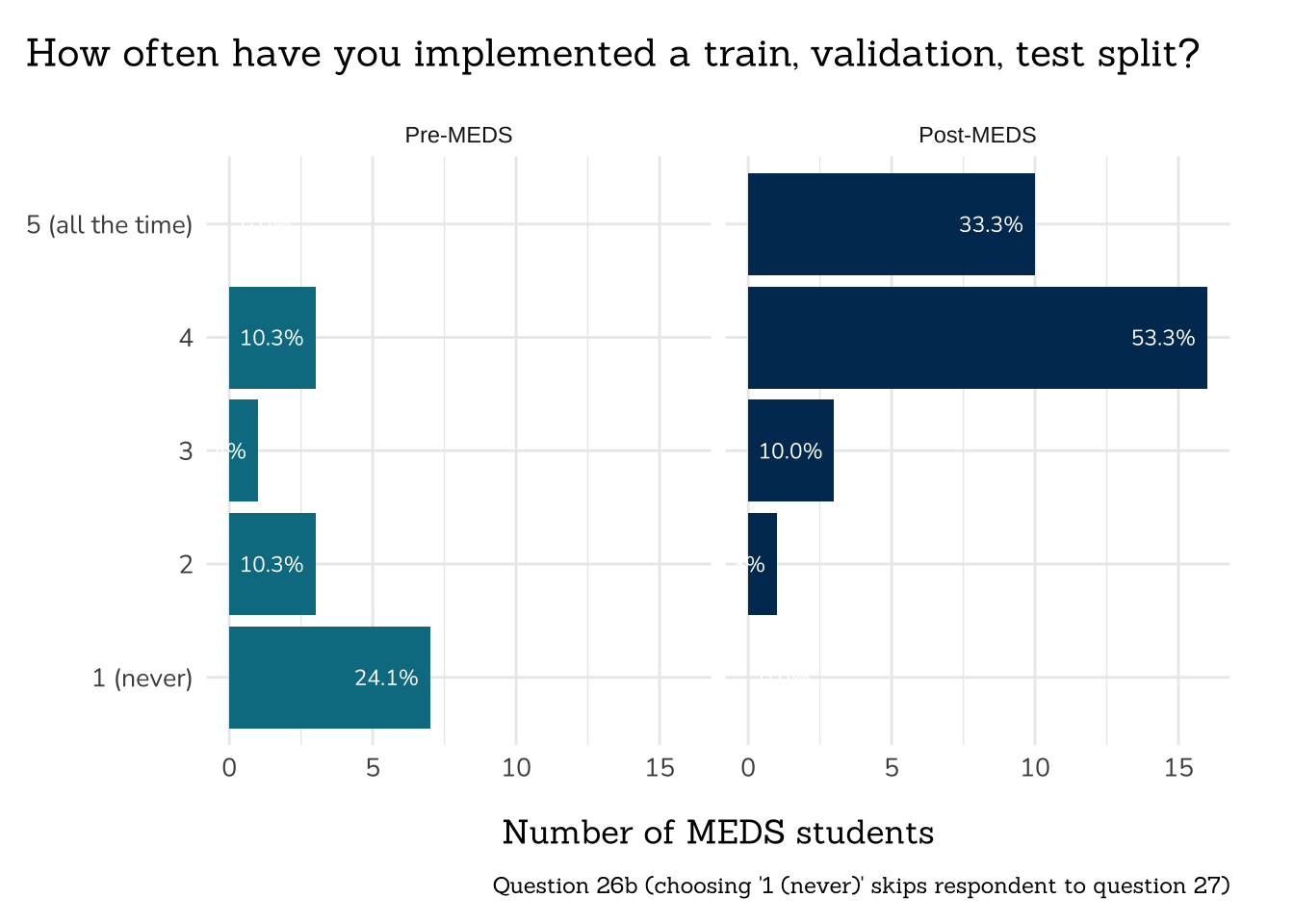 Pre-MEDS: 22/29 student respondents (75.9%) chose a familiarity level of 2 or greater, and therefore were directed to answer Question 25b. Those who answered “1” (7 students) were jumped directly to Question 26 – these non-responses are missing from the Question 25b plot, below, which is why percentages for the Pre-MEDS assessment do not add up to 100%.