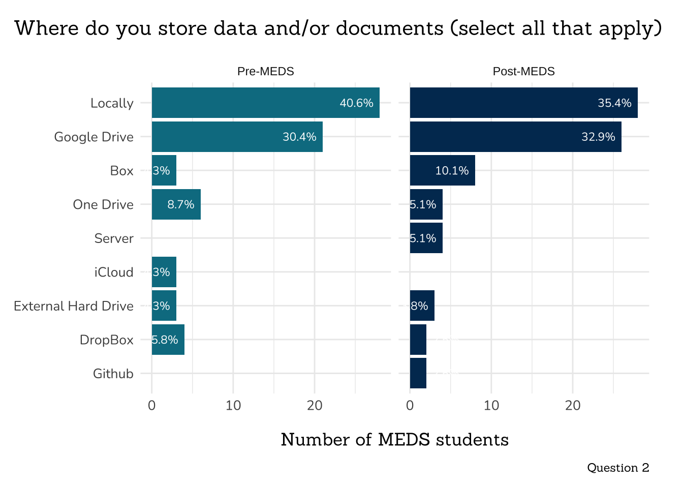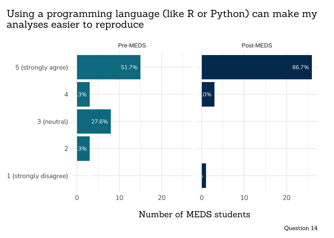 ---title: "MEDS Class of 2025"subtitle: "Program Learning Outcome (PLO) #1 Assessment - Core Knowledge"author: "Sam Shanny-Csik & Jamie Montgomery"date: August 13, 2024date-modified: last-modifiedformat: html: toc: true toc-location: left code-tools: source: true toggle: false theme: - ../styles.scss mainfont: Nunitoexecute: eval: true echo: false message: false warning: falseeditor_options: chunk_output_type: console---```{r}#..........................load packages.........................library(googlesheets4)library(tidyverse)library(janitor)library(showtext)library(ggtext)library(DT)library(tidytext)library(wordcloud)library(scales)#........................import functions........................source(here::here("functions.R"))#..........................import data...........................meds2025_before <-read_sheet("https://docs.google.com/spreadsheets/d/1E3WbMZuOl33sUgbJcPmrqMQbCp3-AsmRAjuxdNXk6oM/edit?gid=1486409728#gid=1486409728")meds2025_after <-read_sheet("https://docs.google.com/spreadsheets/d/1sEetdIXKXQNhVShJHddZd2tnS1QP5-uw0Sk8x3qd7Is/edit?usp=sharing")#...........................clean data...........................meds2025_before_clean <-clean_PLO_data(meds2025_before) |>mutate(timepoint =rep("Pre-MEDS"))meds2025_after_clean <-clean_PLO_data(meds2025_after) |>mutate(timepoint =rep("Post-MEDS"))#...............combine pre- and post-MEDS results...............both_timepoints_clean <-rbind(meds2025_before_clean, meds2025_after_clean) |>mutate(timepoint =fct_relevel(timepoint, c("Pre-MEDS", "Post-MEDS")))#..................number of survey respondents..................=pre_meds_num_respondents <-nrow(meds2025_before_clean)post_meds_num_respondents <-nrow(meds2025_after_clean)#......................import Google fonts.......................sysfonts::font_add_google(name ="Sanchez", family ="sanchez")sysfonts::font_add_google(name ="Nunito", family ="nunito")# automatically use showtext to render text for future devices ----showtext::showtext_auto()#......................create color palette......................meds_pal <-c("Pre-MEDS"="#047C91","Post-MEDS"="#003660")```# **Summary**{{< include /summary-text/class2025/summary.qmd >}}```{r overall-scores}#| fig-align: center#........................Pre-MEDS scores.........................scores_before <- meds2025_before_clean |> select(sc0) mean_score_before <- mean(scores_before$sc0)median_score_before <- median(scores_before$sc0)#........................Post-MEDS scores........................scores_after <- meds2025_after_clean |> select(sc0)mean_score_after <- mean(scores_after$sc0)median_score_after <- median(scores_after$sc0)#..........................combined plot.........................ggplot(both_timepoints_clean, aes(x = sc0)) + geom_histogram(aes(fill = timepoint), color = "white", binwidth = 1, position = "identity", alpha = 0.8) + # add "Pre-MEDS" median score ---- geom_vline(xintercept = median_score_before, linetype = "dashed", color = "#047C91") + annotate(geom = "segment", x = 7, y = 8, xend = median_score_before, yend = 7.5, arrow = arrow(length = unit(3, "mm")), color = "#047C91") + annotate(geom = "label", x = 9.8, y = 8, label = paste0("Median Score = ", median_score_before), hjust = "right", color = "#047C91") + # add "Post-MEDS" median score ---- geom_vline(xintercept = median_score_after, linetype = "dashed", color = "#003660") + annotate(geom = "segment", x = 13, y = 8, xend = median_score_after, yend = 7.5, arrow = arrow(length = unit(3, "mm")), color = "#003660") + annotate(geom = "label", x = 14, y = 8, label = paste0("Median Score = ", median_score_after), hjust = "center", color = "#003660") + # make pretty ---- coord_cartesian(clip = "off") + scale_fill_manual(values = meds_pal) + scale_x_continuous(breaks = seq(1, 14, 1)) + labs(x = "Score", y = "Number of MEDS students", title = "Distribution of scores", caption = "Out of 14 available points") + meds_theme()```# **Individual Questions**## **Part 1: OS and data/document storage**```{r Q1-what-OS}##~~~~~~~~~~~~~~~~~~~~~~~~~~~~~~## ~ Question 1: What OS? ----##~~~~~~~~~~~~~~~~~~~~~~~~~~~~~~q1_os_data <- clean_q1_os(both_timepoints_clean)plot_q1_os(q1_os_data)``````{r Q2-data-storage}#| fig-cap: "NOTE: Percentages will not sum to 100%"##~~~~~~~~~~~~~~~~~~~~~~~~~~~~~~~~~~~~~~~~~~~~~~## ~ Question 2: Where do you store data? ----##~~~~~~~~~~~~~~~~~~~~~~~~~~~~~~~~~~~~~~~~~~~~~~# combine written-in "Other" option responses ----server <- c("Server", "Taylor server", "external server", "Taylor", "Server", "workbench", "Workbench 1 & 2", "Cyberduck", "server")external_drive <- c("External SSD", "External drive", "external hard drive", "Back up hard drive", "locally on my phone and on my external hard drive", "external ssd, on occasion")icloud <- c("icloud")github <- c("github")locally <- c("Locally on my computer")# wrangle & plot ----q2_store_data <- clean_q2_store_data(both_timepoints_clean)plot_q2_store_data(q2_store_data)```## **Part 2: How often do you currently use the following?**```{r Q3-GUI}##~~~~~~~~~~~~~~~~~~~~~~~~~## ~ Question 3: GUI ----##~~~~~~~~~~~~~~~~~~~~~~~~~# wrangle ----q3_gui_data <- clean_freq_rank_data(all_PLO_data = both_timepoints_clean, col_name = "point_and_click_gui", categories = c("Never", "Less than once per year", "Several times per year", "Monthly", "Weekly", "Daily"))# plot ----plot_freq_use_data(data = q3_gui_data, title = "A specialized software with a point-and-click graphical user\ninterface (e.g., for statistical analysis: SPSS, SAS...;for Geospatial\nanalysis: ArcGIS, QGIS...; for Genomics analysis: Geneious, …)", caption = "Question 3")``````{r Q4-prog-lang}##~~~~~~~~~~~~~~~~~~~~~~~~~~~~~~~~~~~~~~~~~~~## ~ Question 4: Programming Languages ----##~~~~~~~~~~~~~~~~~~~~~~~~~~~~~~~~~~~~~~~~~~~# wrangle ----q4_prog_lang_data <- clean_freq_rank_data(all_PLO_data = both_timepoints_clean, col_name = "program_lang", categories = c("Never", "Less than once per year", "Several times per year", "Monthly", "Weekly", "Dail
