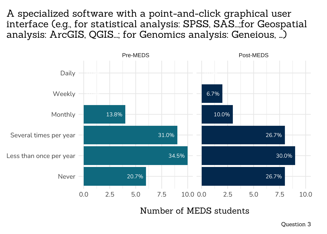 Pre-MEDS: 14/29 student respondents (48.3%) chose a familiarity level of 2 or greater, and therefore were directed to answer Question 26b. Those who answered “1” (15 students) were jumped directly to Question 27 – these non-responses are missing from the Question 26b plot, below, which is why percentages for the Pre-MEDS assessment do not add up to 100%.