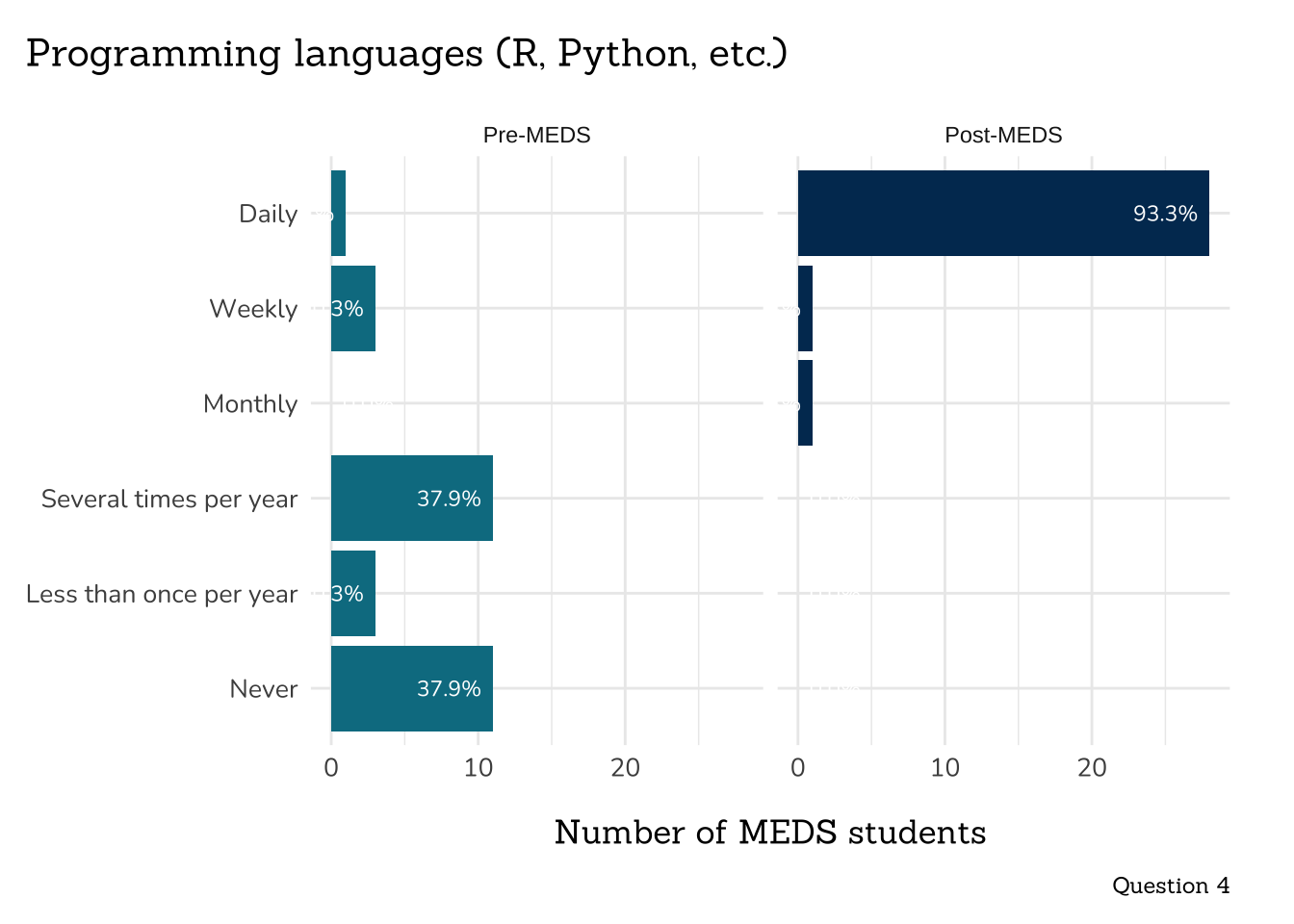 The survey consists of 31 questions (28 multiple choice, 3 short free-response) and takes ~30 minutes to complete. Questions 1 - 15 ask respondents to rank how often they use certain data science tools or workflows, or familiarity / comfort levels with particular topics (see Part 1 through Part 4, below). Questions 16 - 31 assess respondents’ familiarity and application of domain-specific knowledge / tools taught during the MEDS program (see Part 5 onward, below). Many of these question types are multi-part and begin with a question phrased as: