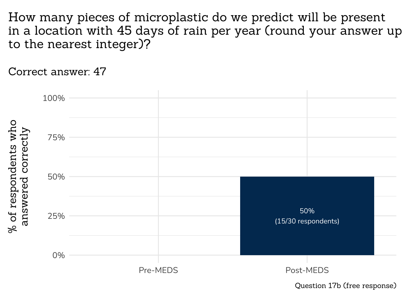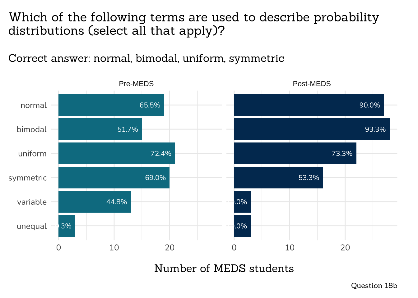 The percentage of respondents who provided a fully correct answer to Queston 18b increased from Pre- to Post-MEDS PLO assessments