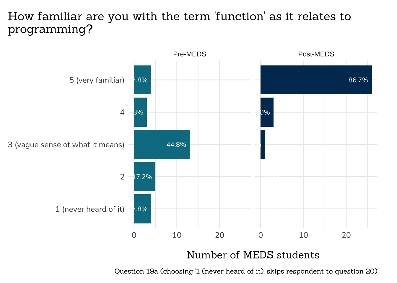 Pre-MEDS: 25/29 student respondents (86.2%) chose a familiarity level of 2 or greater, and therefore were directed to answer question 19b.