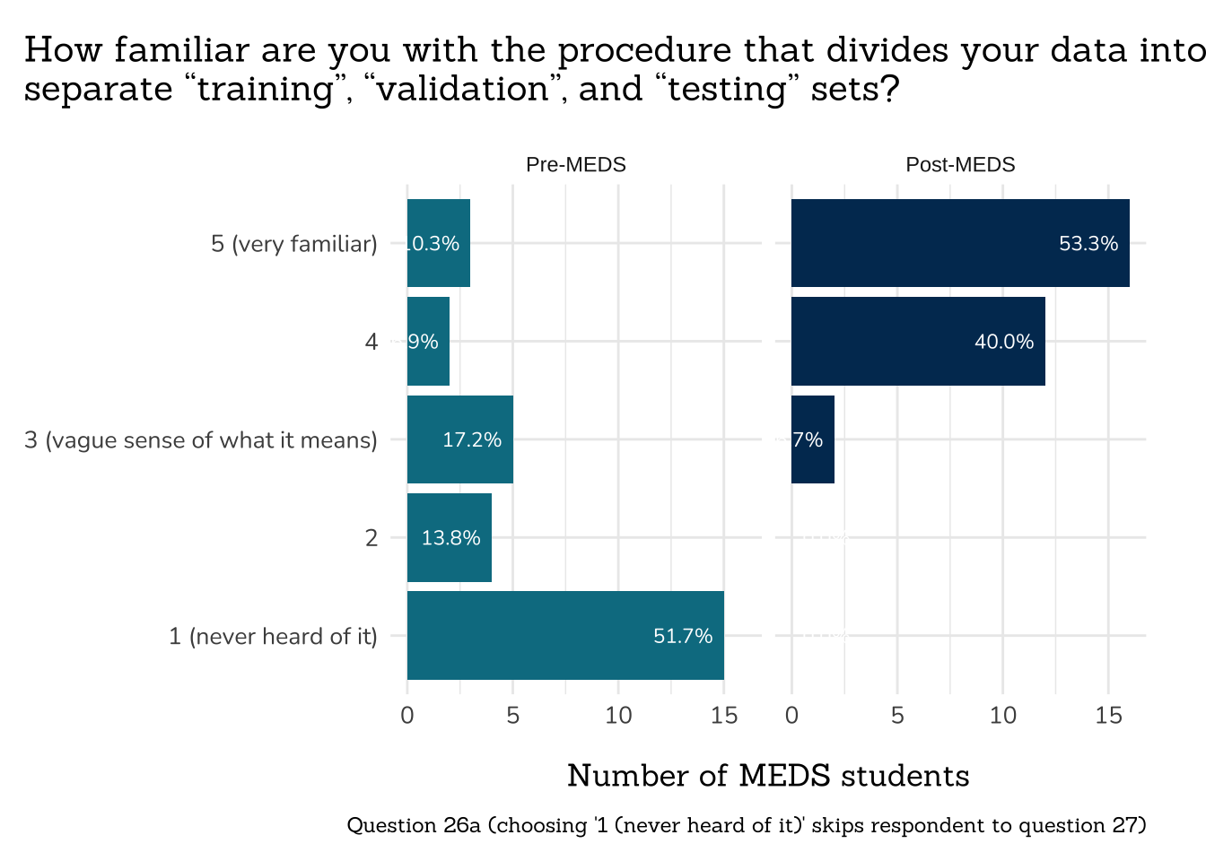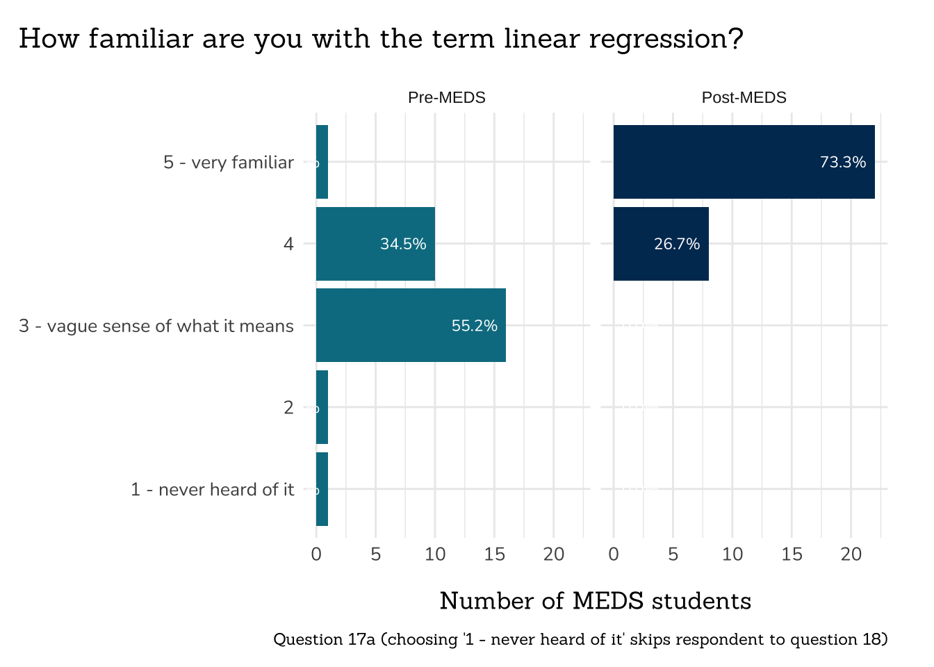 Pre-MEDS: 28 / 29 student respondents (96.6%) chose a familiarity level of 2 or greater, and therefore were directed to answer all parts of Question 17b.