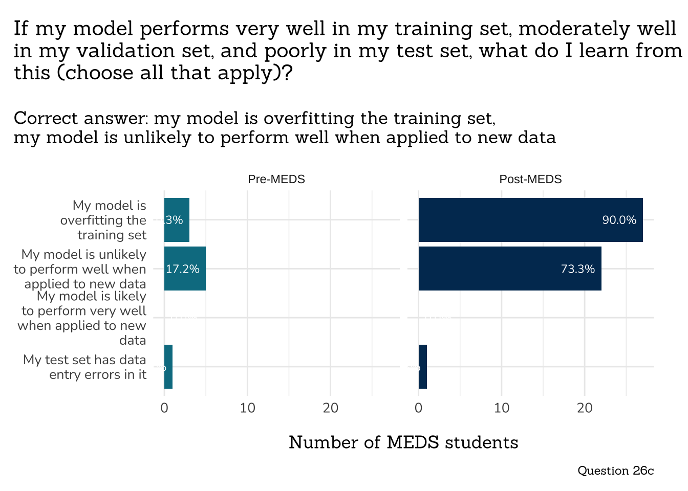 Only students who chose 2 or greater in Question 26b were directed to answer Question 26c. A fully correct answer means choosing exactly the following options: My model is overfitting the training set, My model is unlikely to perform well when applied to new data.