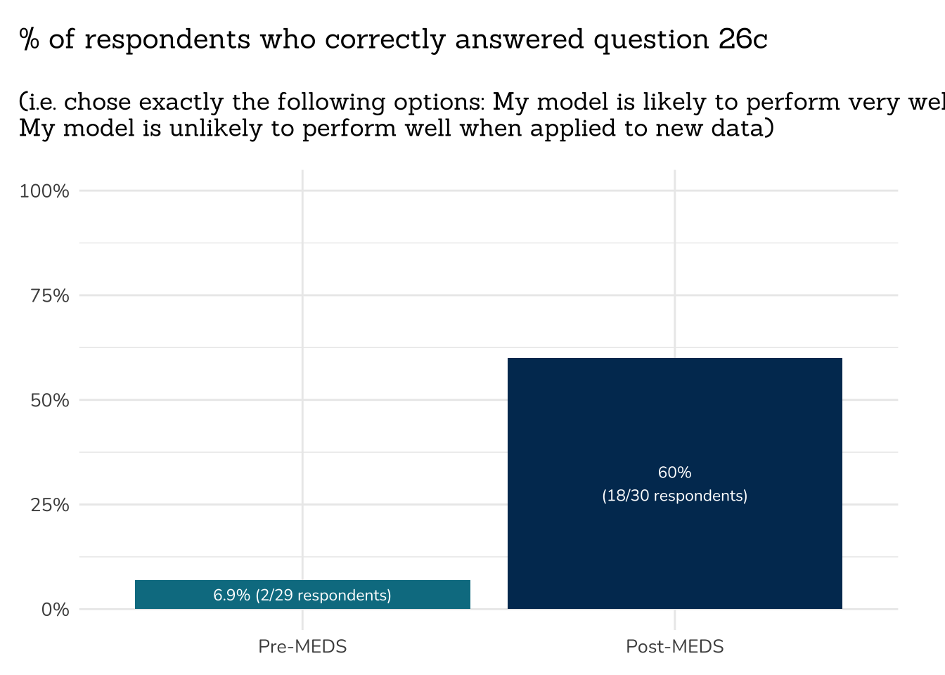 The percentage of respondents who provided a fully correct answer to Queston 26c increased from Pre- to Post-MEDS PLO assessments