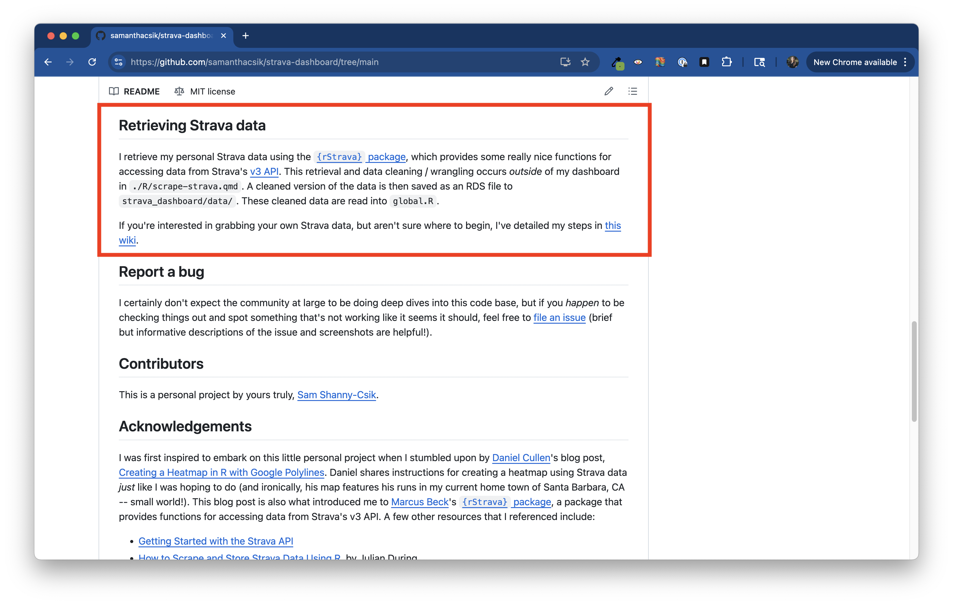 Information on what tools (i.e. {rStrava}) I used to scrape my data, where that data retrieval / wrangling occurs, and where I save my cleaned data to. Also note that I mention a wiki – more on that soon.