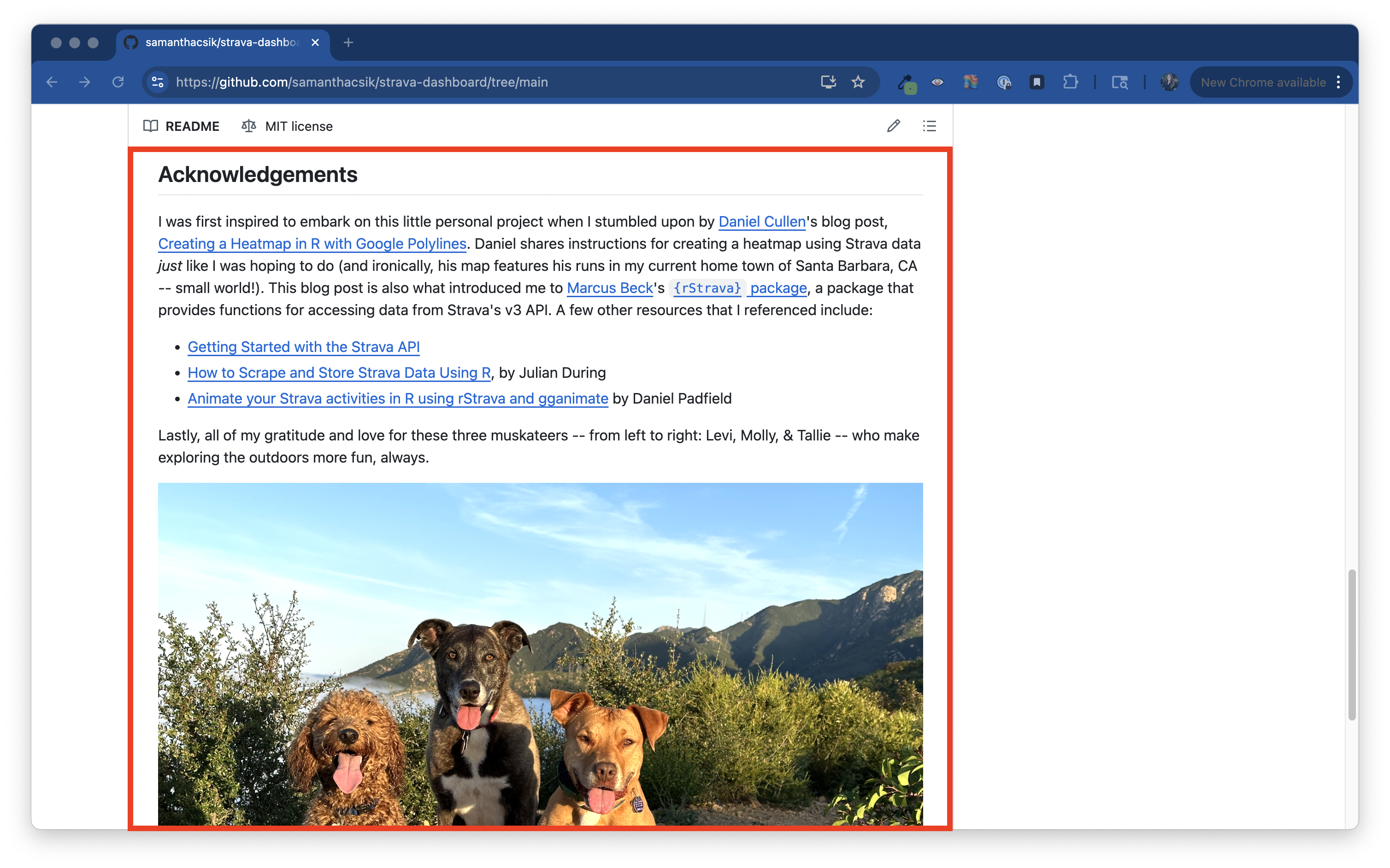 My acknowledgements section includes links to a variety of blog posts, articles, and software that I referenced / used while building my dashboard. It also, importantly (though not at all necessary), includes a pup pic.