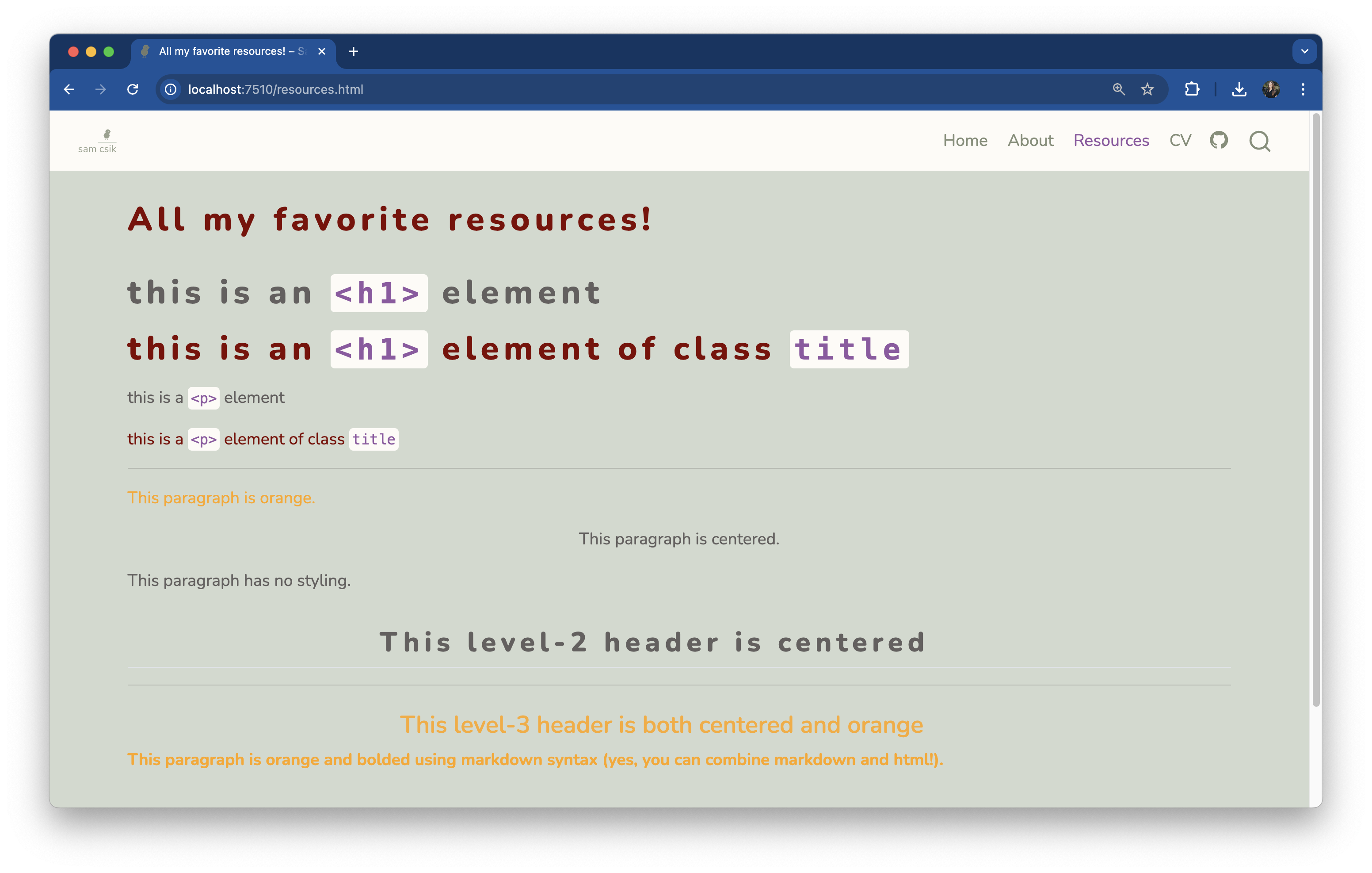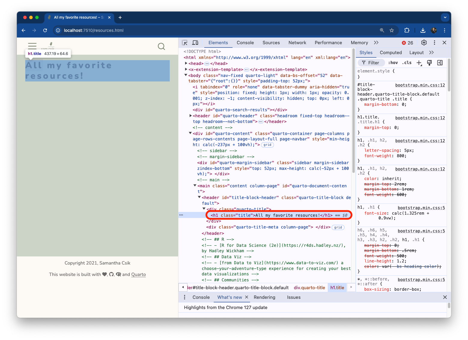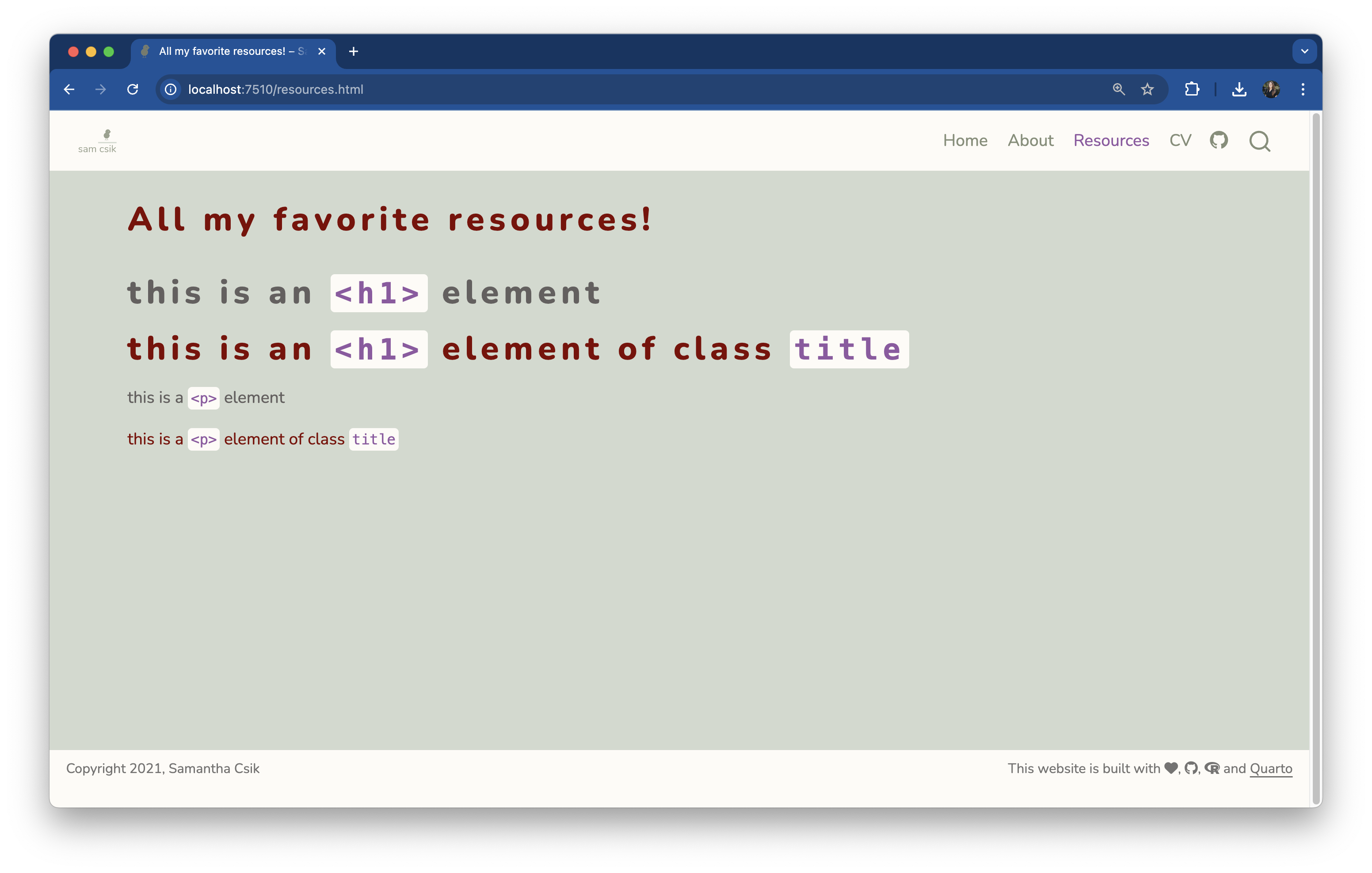 We noted that the page titles (“About” on the About page and “All my favorite resources!” on the Resources page), are all <h1> elements and are also given the class, title (e.g. <h1> class="title">All of my favorite resources!</h1>). This means that the Quarto framework has already defined a class selector called .title and applied that class to the above elements.