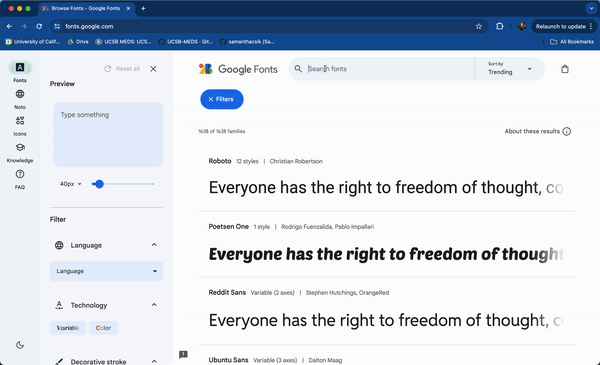 Look for the code chunk titled, Sen: CSS class for a variable style on the Embed code page. We’ll want to grab the value specified after the font-family property (here, that value is, "Sen", sans-serif;).