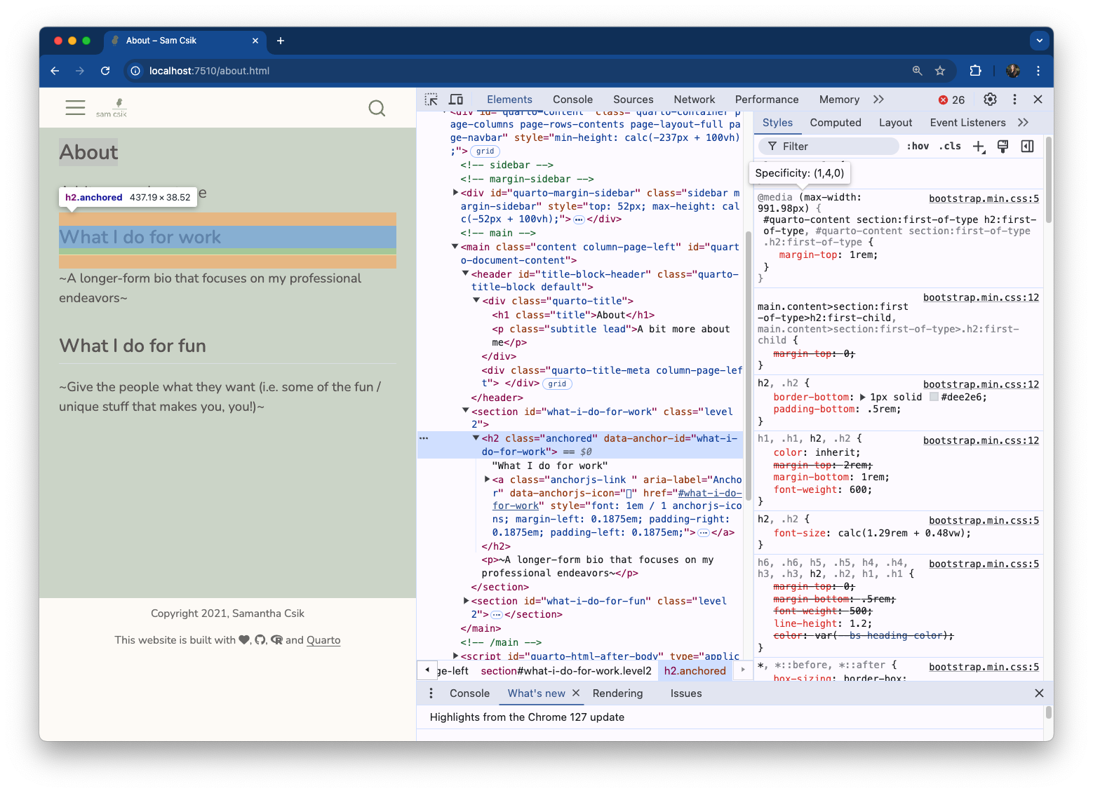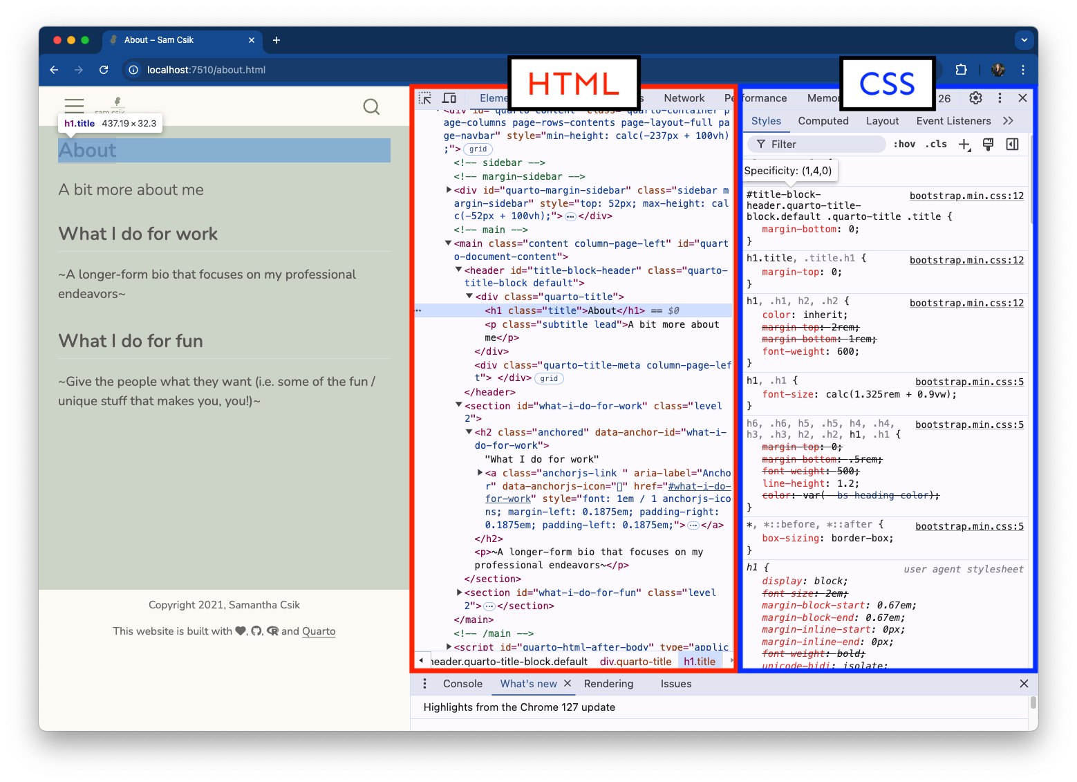 It’s important to note that we didn’t need to make any changes to the HTML (in about.qmd, and resources.qmd) since those <h1> elements are already assigned the class, title. Updates are automatically applied to any elements that the Quarto framework has already assigned as that class.