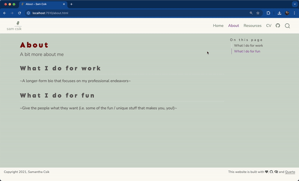 Quarto gives us an easy-to-use web publishing format to create our personal websites – we can develop in a space that is comfortable (for me, that’s RStudio) and write mostly Markdown syntax (which is rendered as HTML when we build our website). A massive benefit is that these websites already look pretty slick right out of the box.
