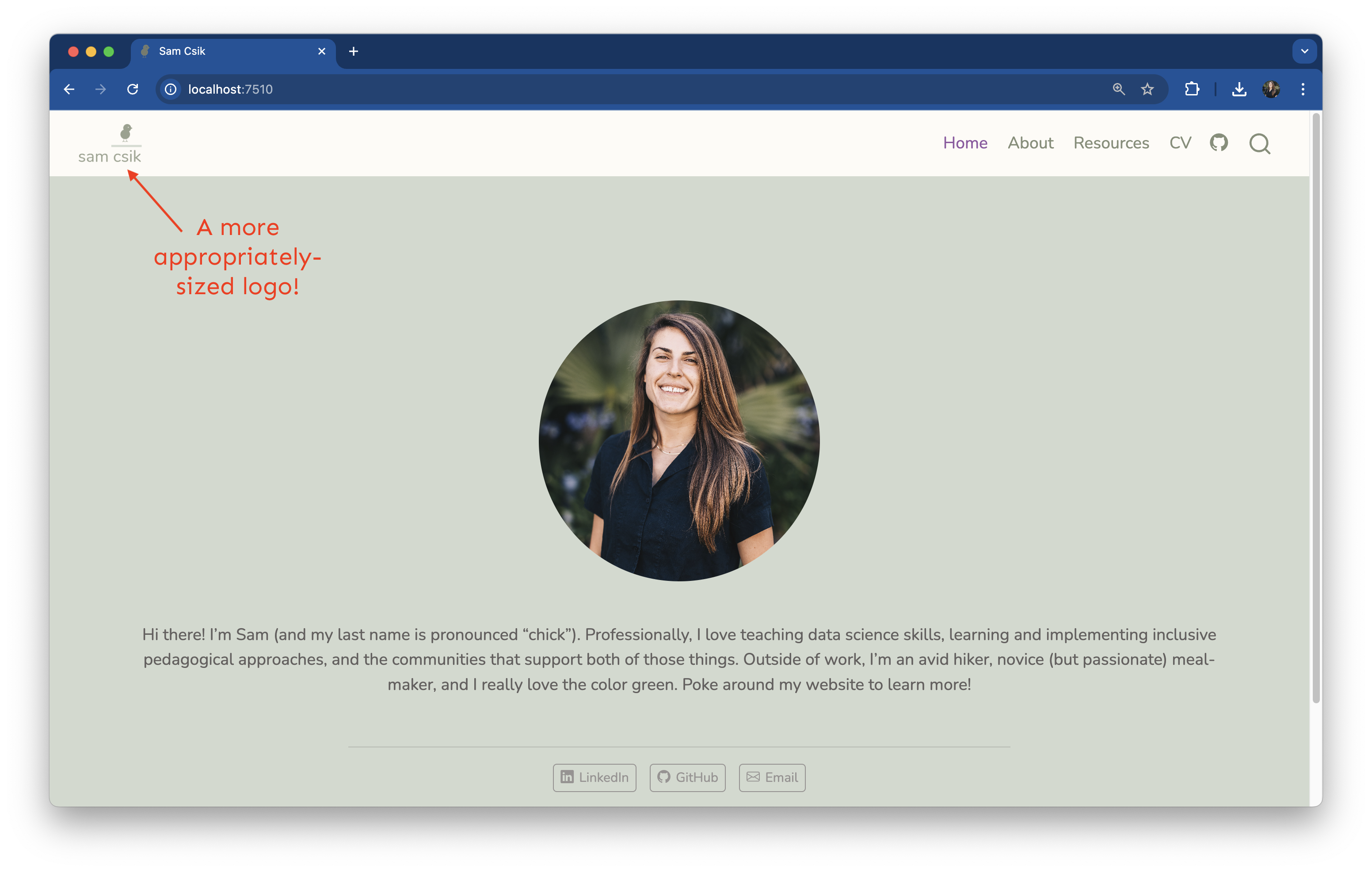Let’s add a CSS rule to increase the size of our logo. Be sure to add this rule beneath your /*-- scss:rules --*/ region decorator, and note that you may need to adjust the max-height value to best suit your own personal logo: