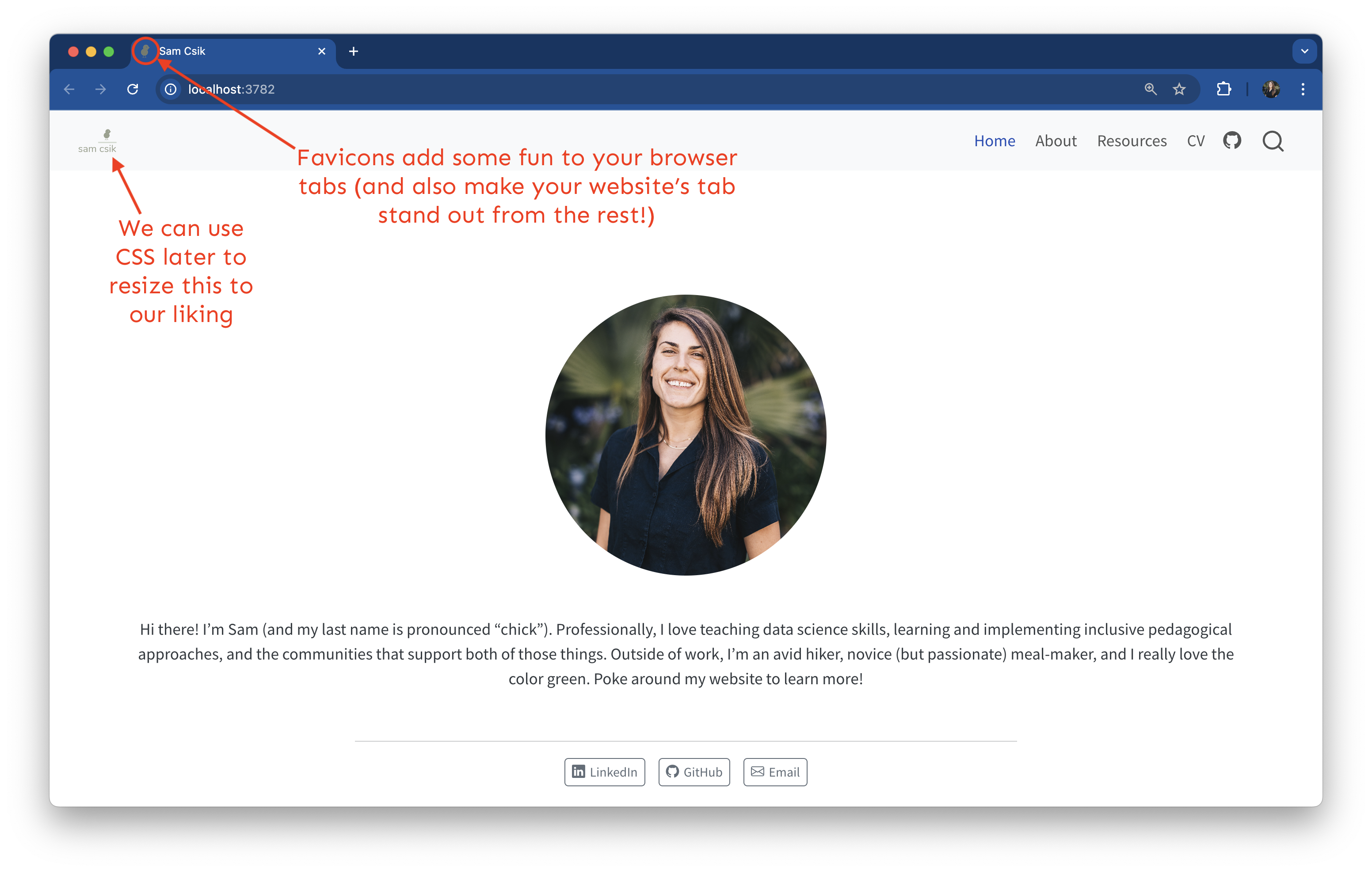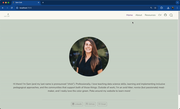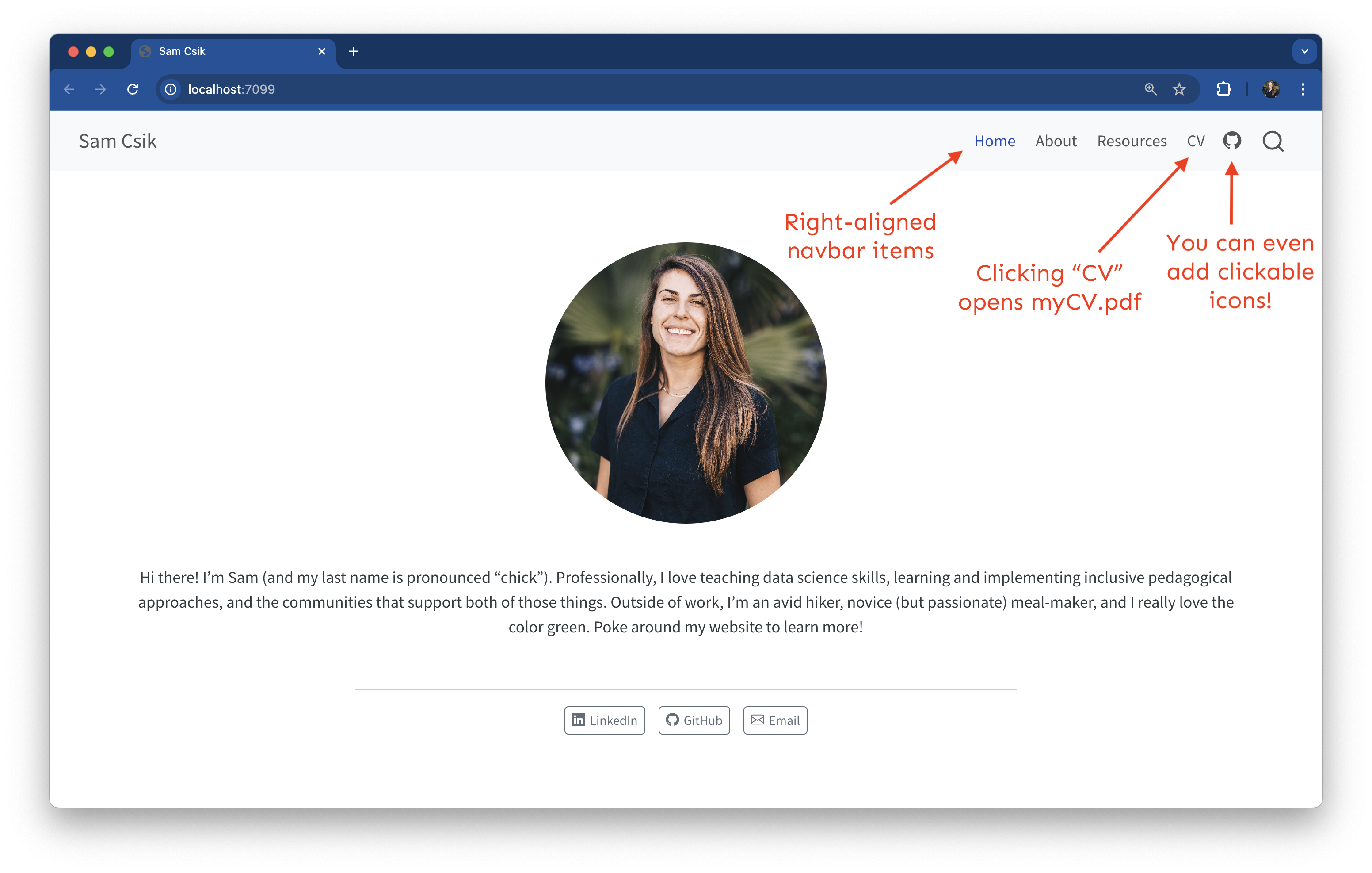 Here, we moved our navbar items to the right side, link to a curriculum vitae (pdf), and also add a GitHub icon which links to a GitHub profile.