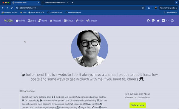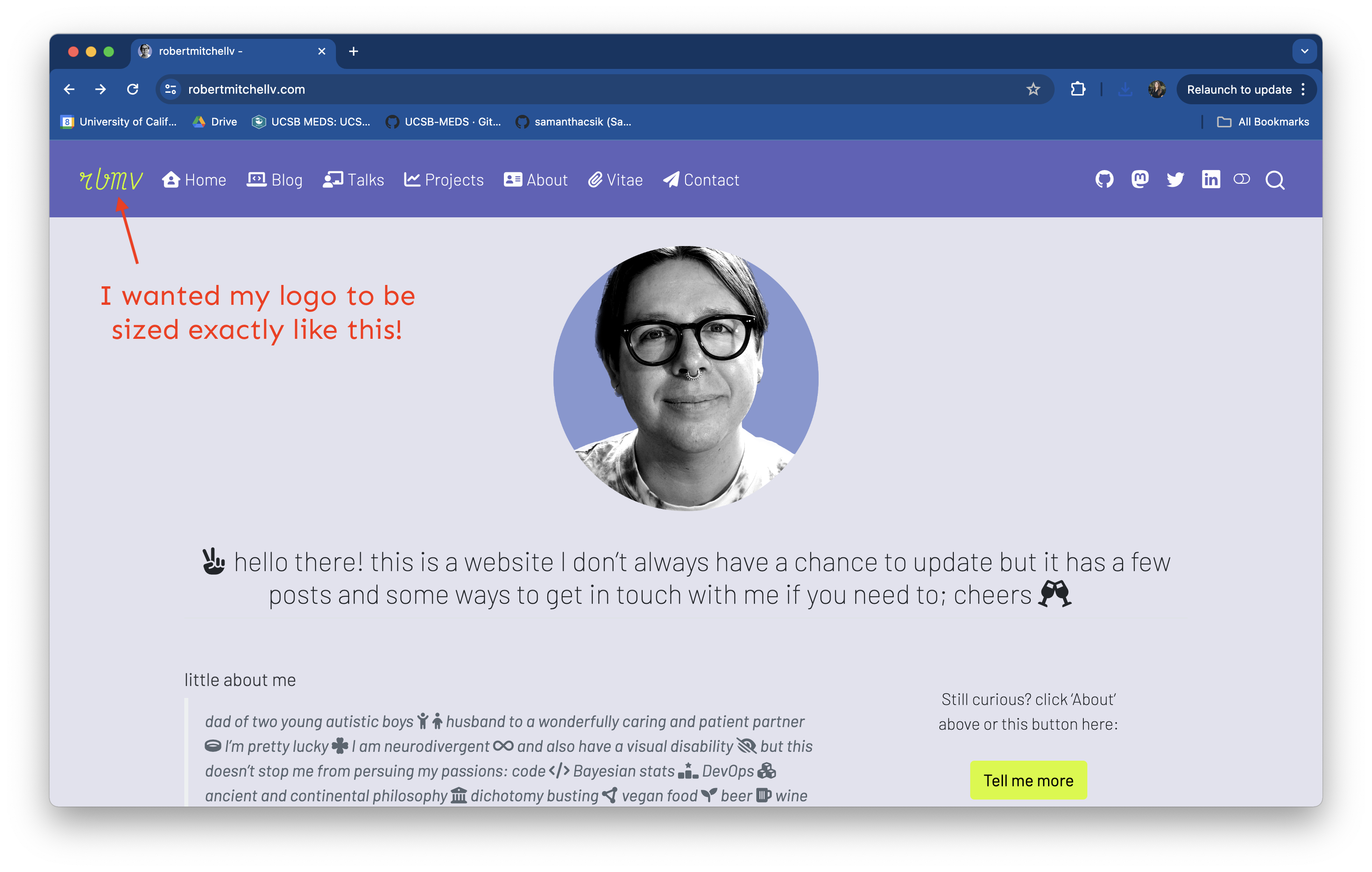 More specifically, I stumbled upon Robert Mitchell’s personal website (built with Quarto) and noticed that he too had a logo, and that it was perfectly sized to fit the navbar space: