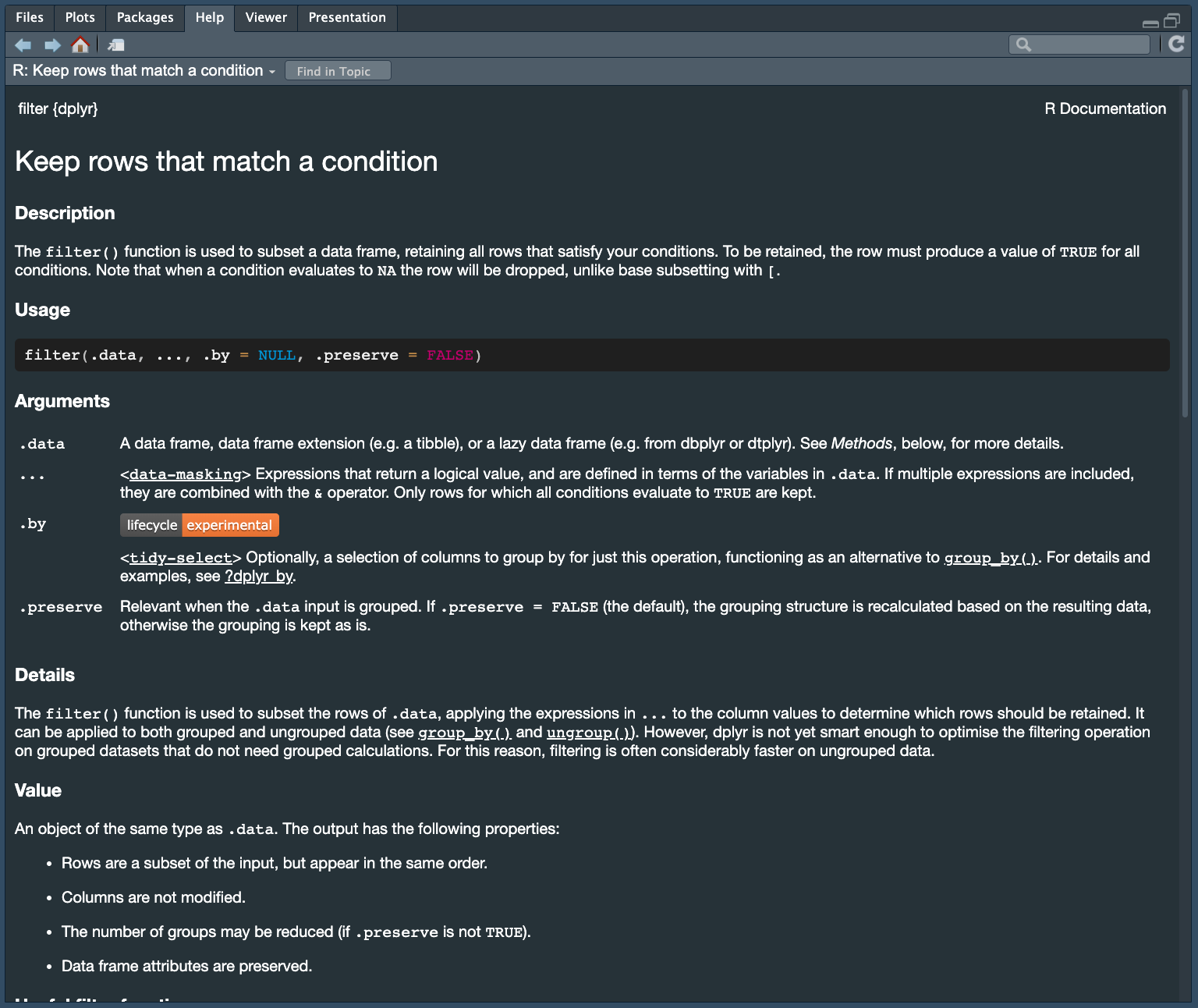 Vignettes are long-form guides / tutorials for R packages. These can offer helpful (and often less jargony) examples and explanations for how to use various functions. Check for a vignette by typing vignette("package_name") in your console. E.g. if we want to learn more about how to use filter(), which comes from the {dplyr} package: