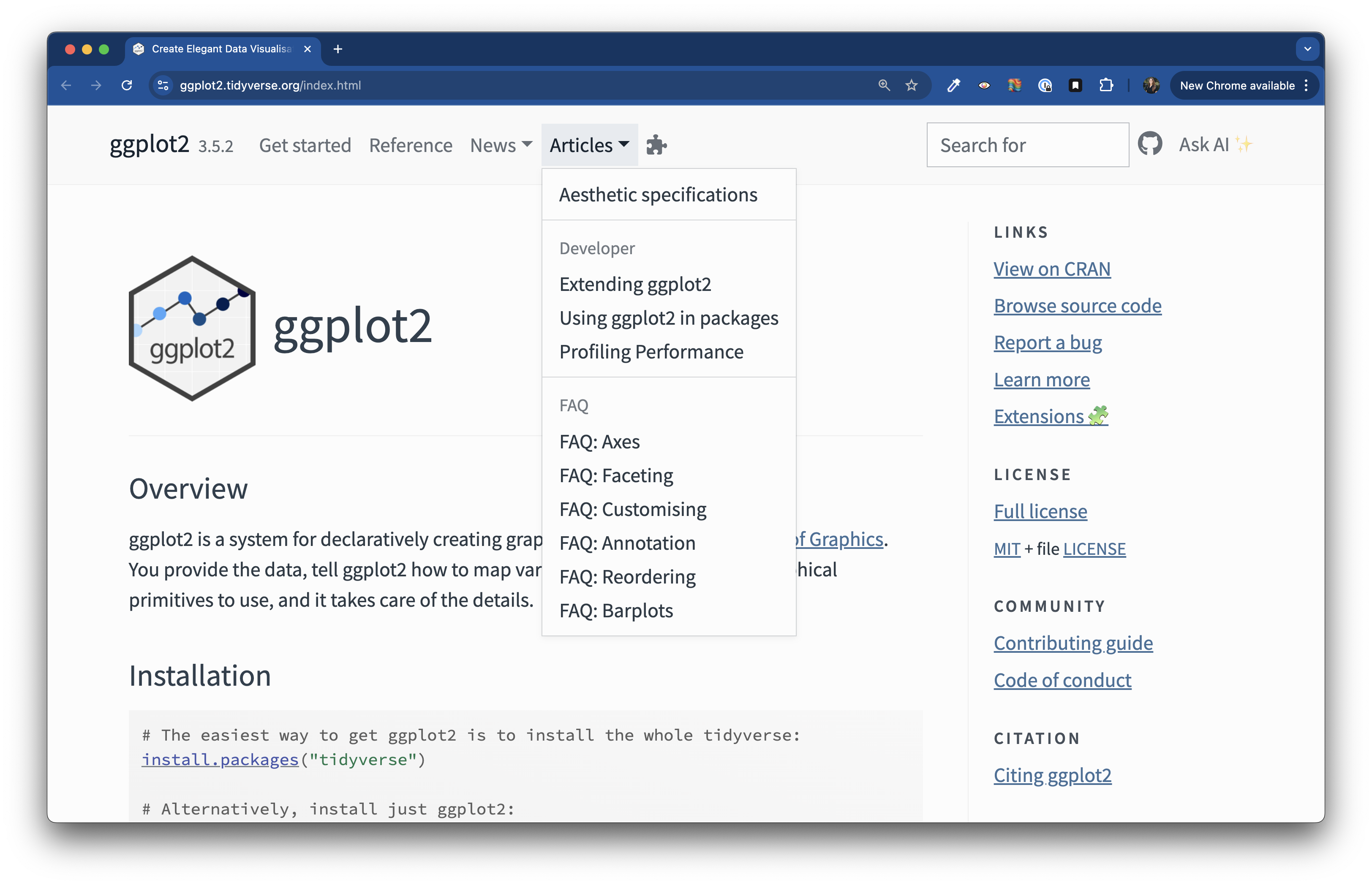 We already saw how to access documentation directly from RStudio, but looking at the official documentation online may reveal additional helpful articles, FAQs, and resources. Documentation sites built with pkgdown are particularly easy to navigate (they all are structured the same) and approachable. For example, the {ggplot2} pkgdown documentation:
