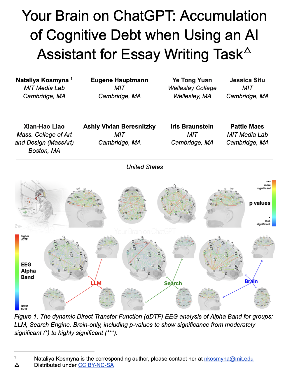 “The LLM undeniably reduced the friction involved in answering participants’ questions compared to the Search Engine. However, this convenience came at a cognitive cost, diminishing users’ inclination to critically evaluate the LLM’s output or”opinions” (probabilistic answers based on the training datasets). This highlights a concerning evolution of the ‘echo chamber’ effect: rather than disappearing, it has adapted to shape user exposure through algorithmically curated content. What is ranked as “top” is ultimately influenced by the priorities of the LLM’s shareholders.”