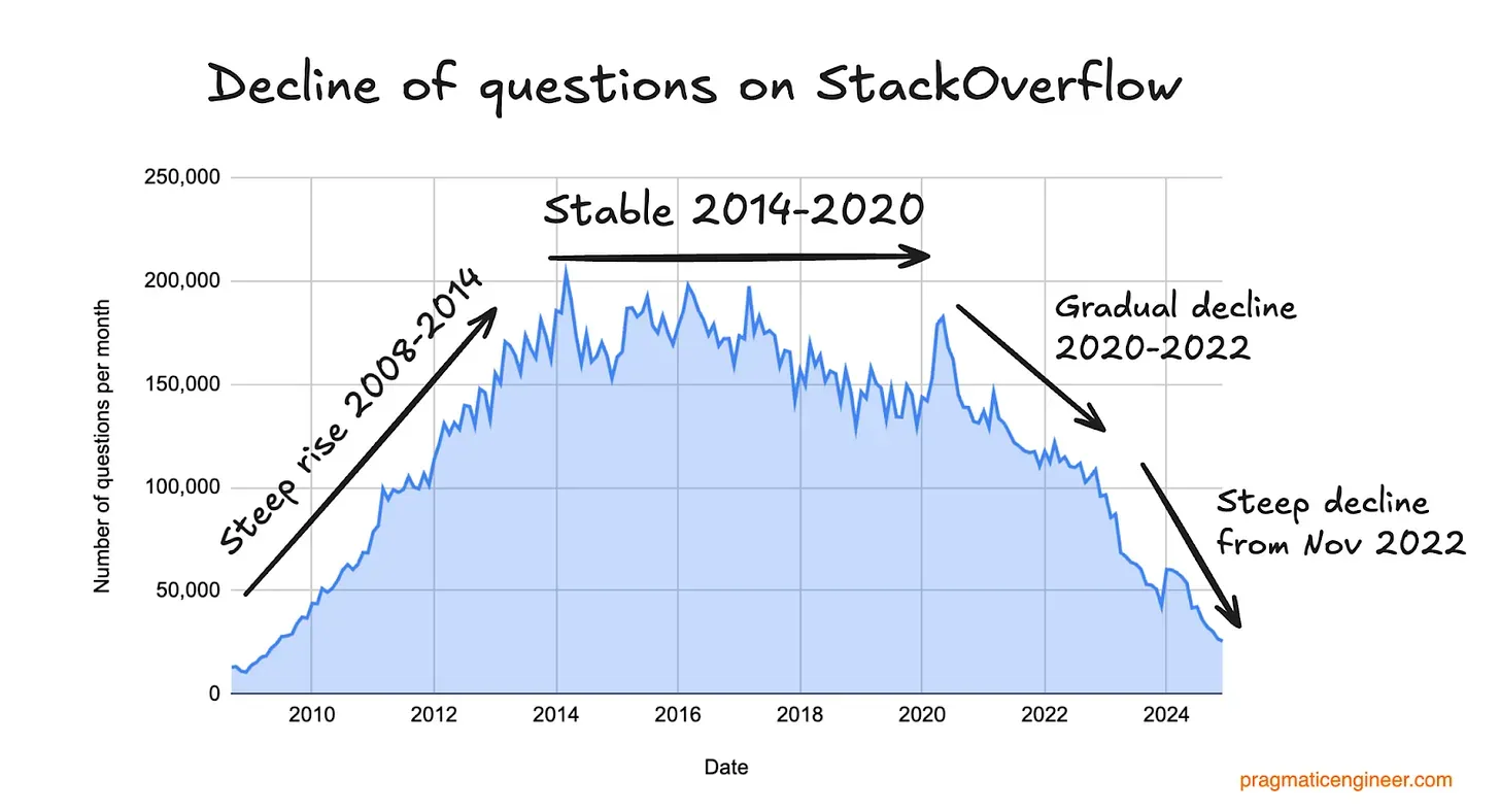 The implications of this decline still remain to be fully seen, though research suggests that replacing human content creation with AI-generated responses may make it more difficult to train future AI models. This change also represents a shift of knowlege sharing from the public to private domains (del Rio-Chanona et al. 2024).